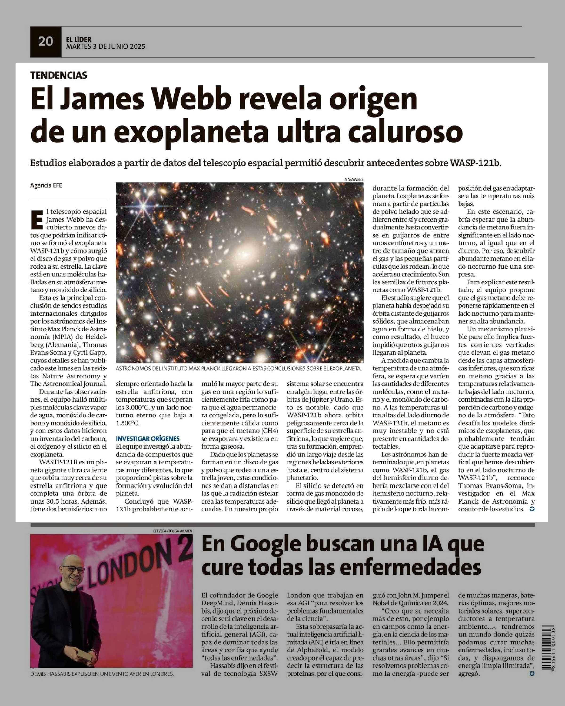 El James Webb revela origen de un exoplaneta ultra caluroso 03-06-2025 El Líder |
