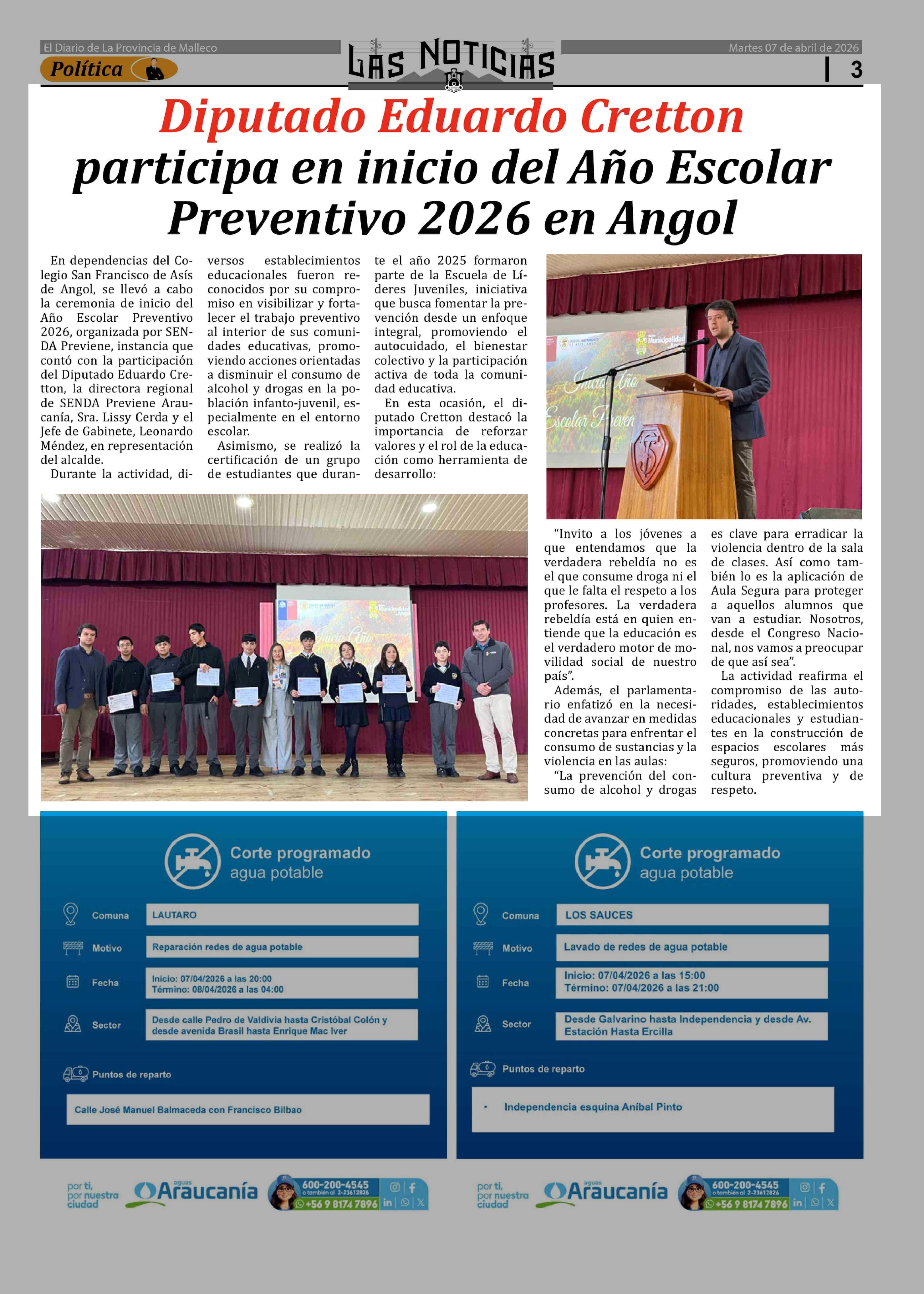 Diputado Eduardo Cretton participa en inicio del Año Escolar Preventivo 2026 en Angol 07-04-2026 Las Noticias |