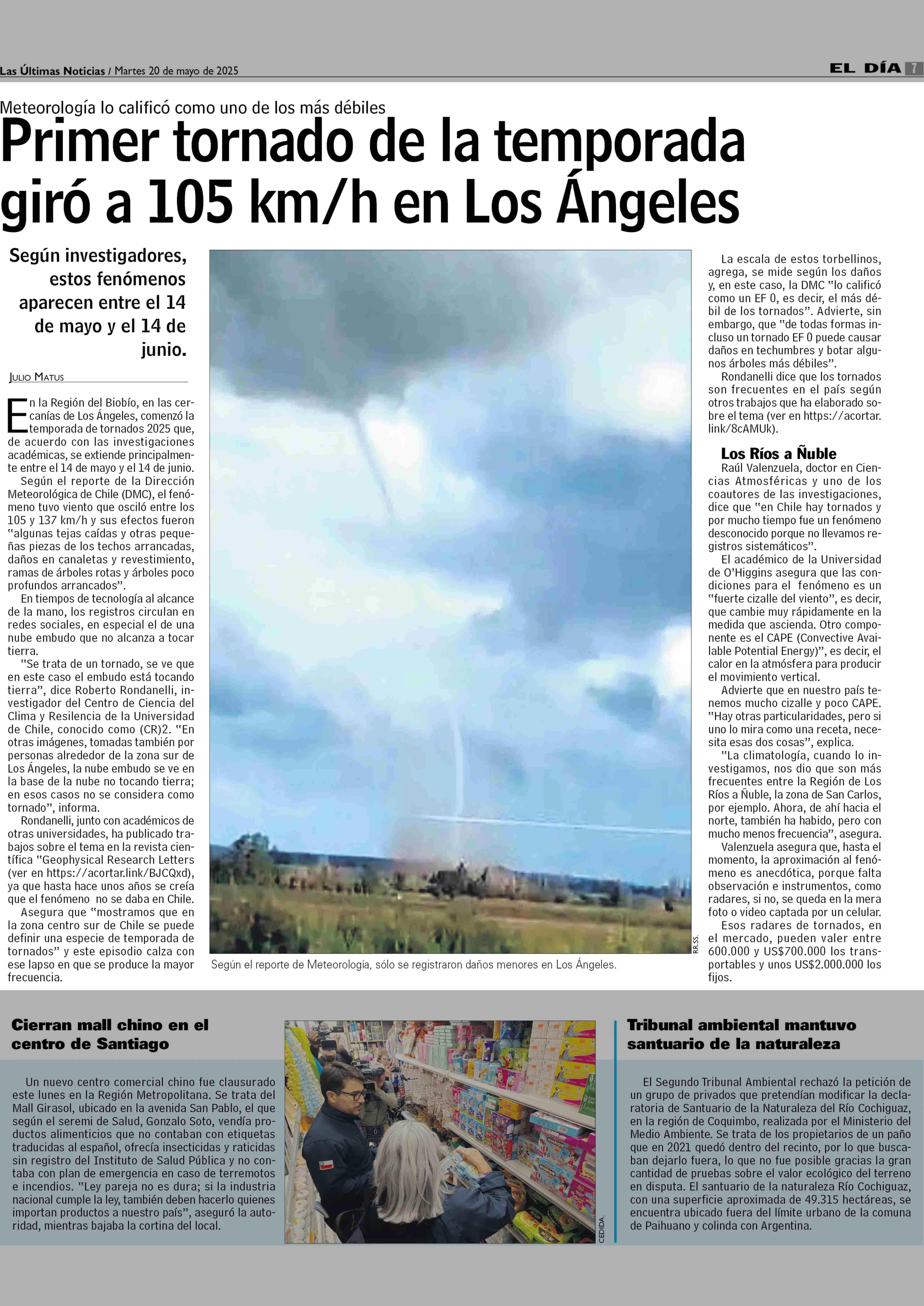 Primer tornado de la temporada giró a 105 km/h en Los Angeles 20-05-2025 Las Últimas Noticias |