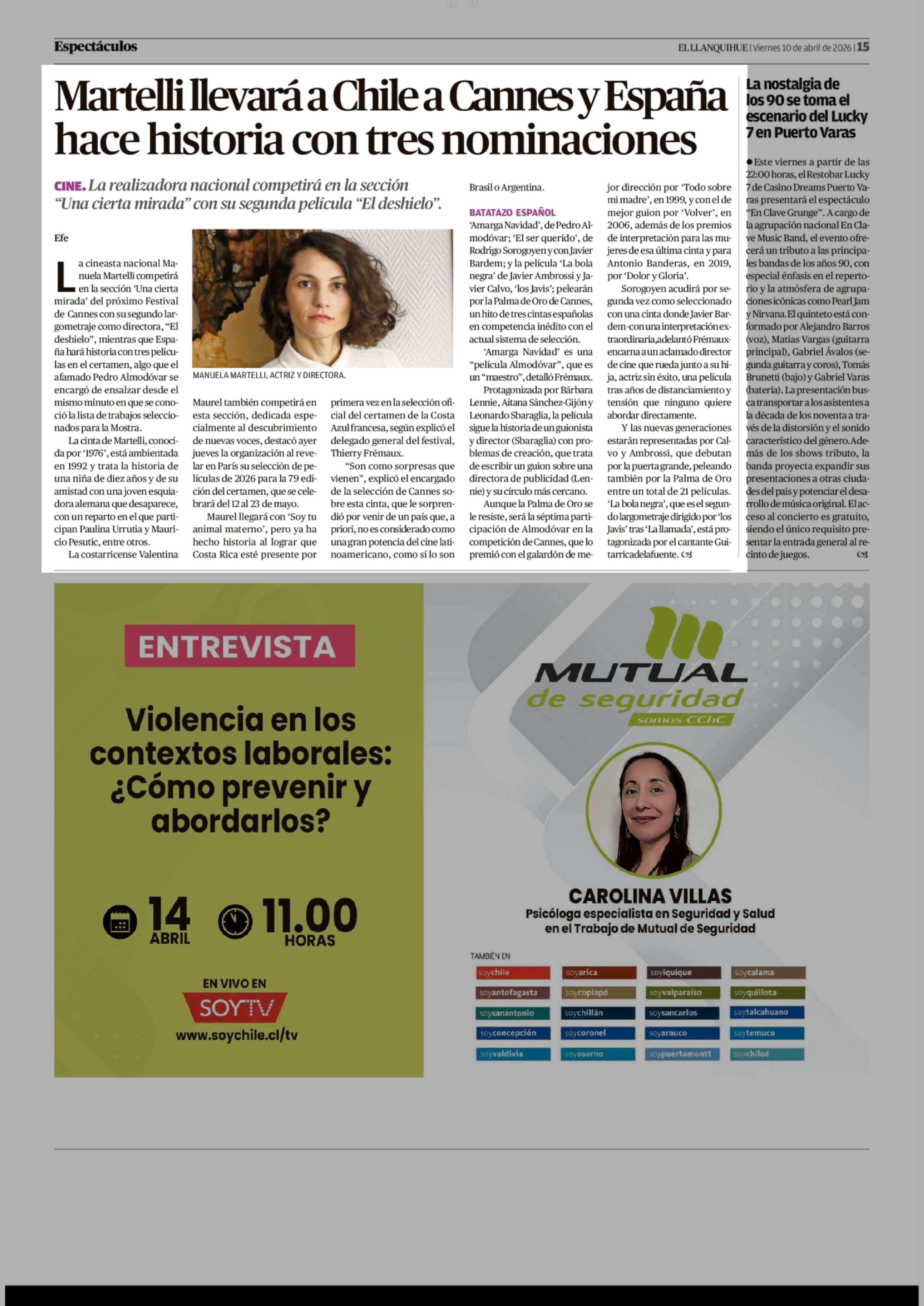Martelli llevará a Chile a Cannes y España hace historia con tres nominaciones 10-04-2026 El Llanquihue |