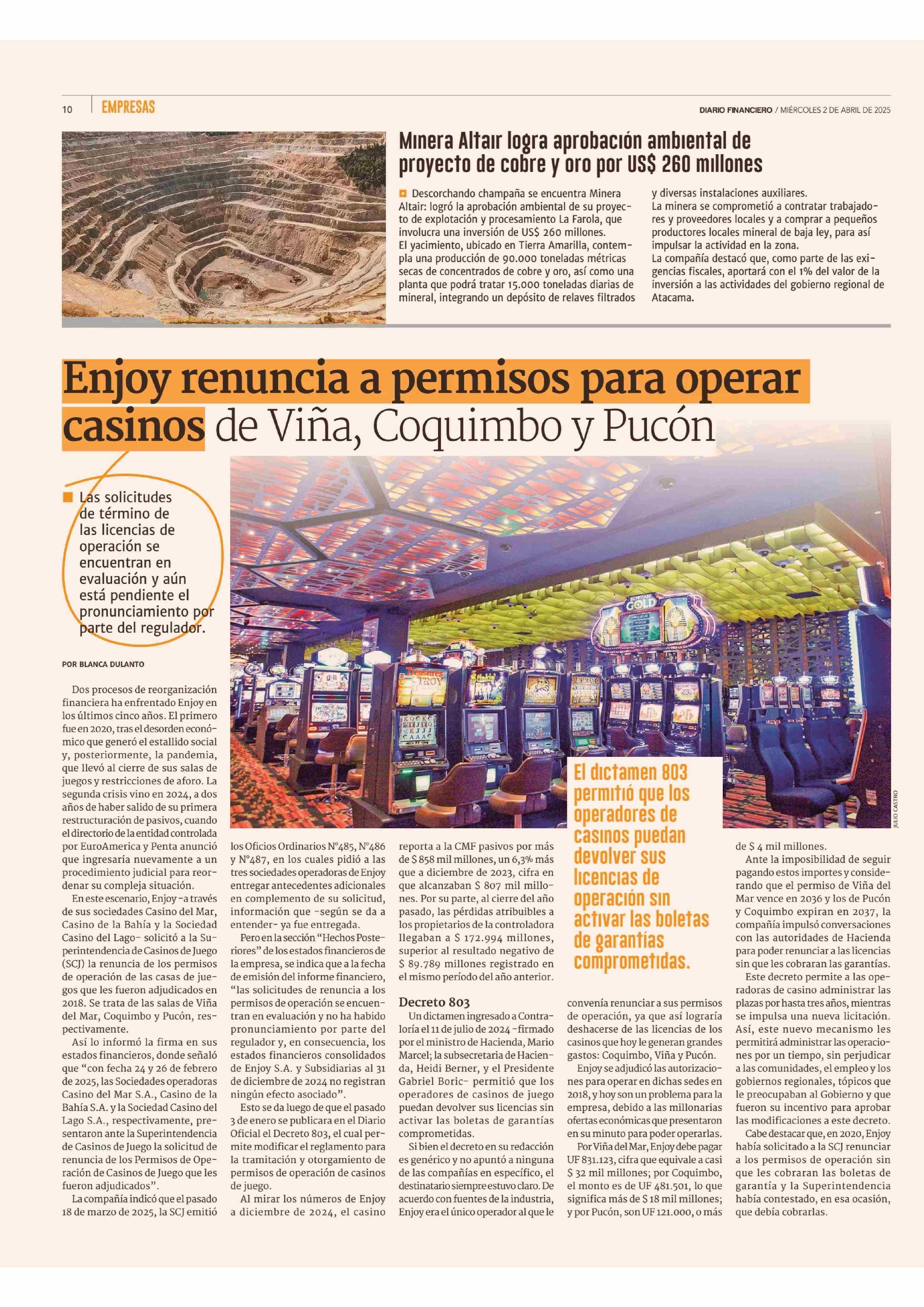 Enjoy renuncia a permisos para operar casinos de Viña, Coquimbo y Pucón 02-04-2025 Diario Financiero |