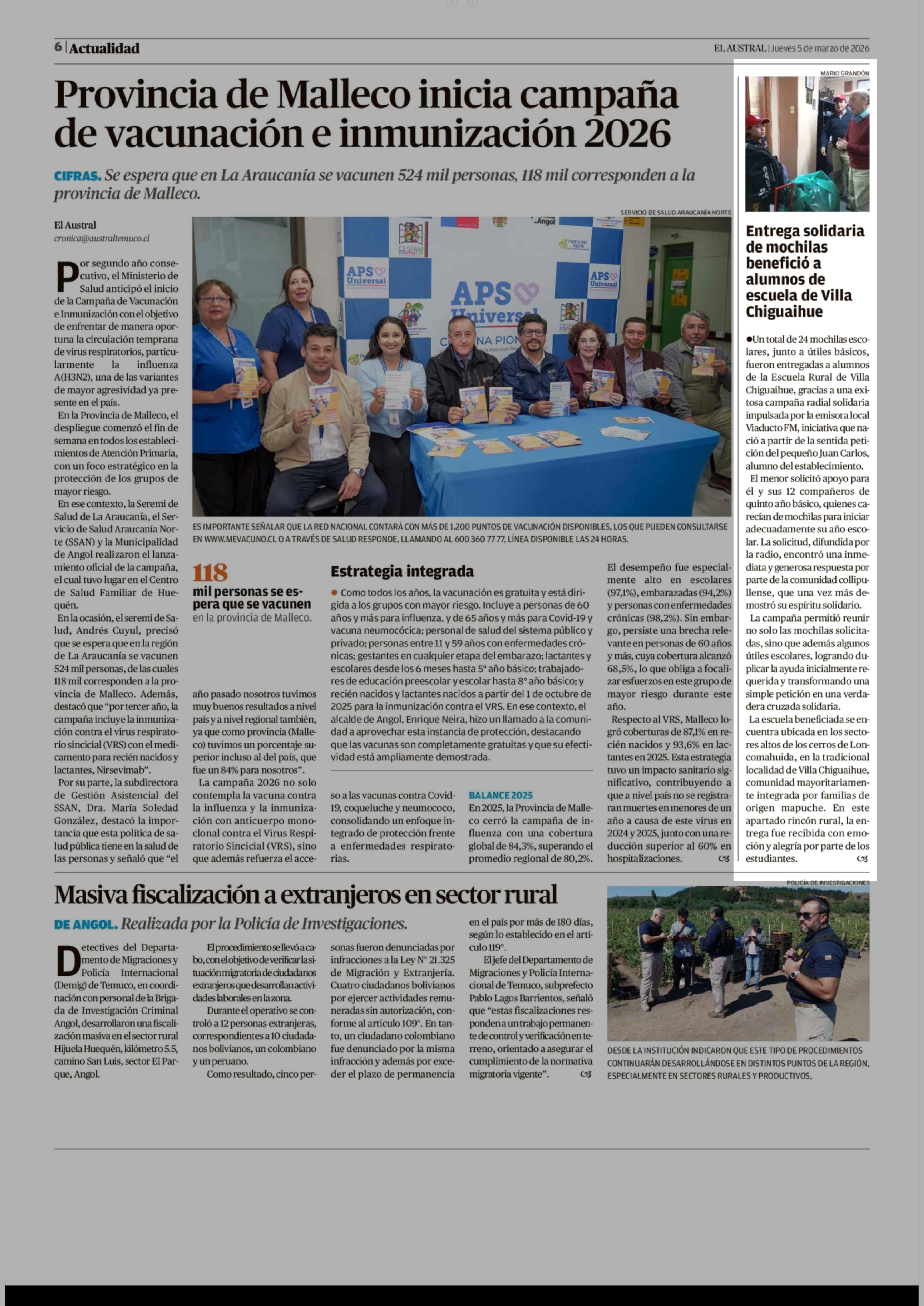 Entrega solidaria de mochilas benefició a alumnos de escuela de Villa Chiguaihue 05-03-2026 El Austral de la Araucanía |