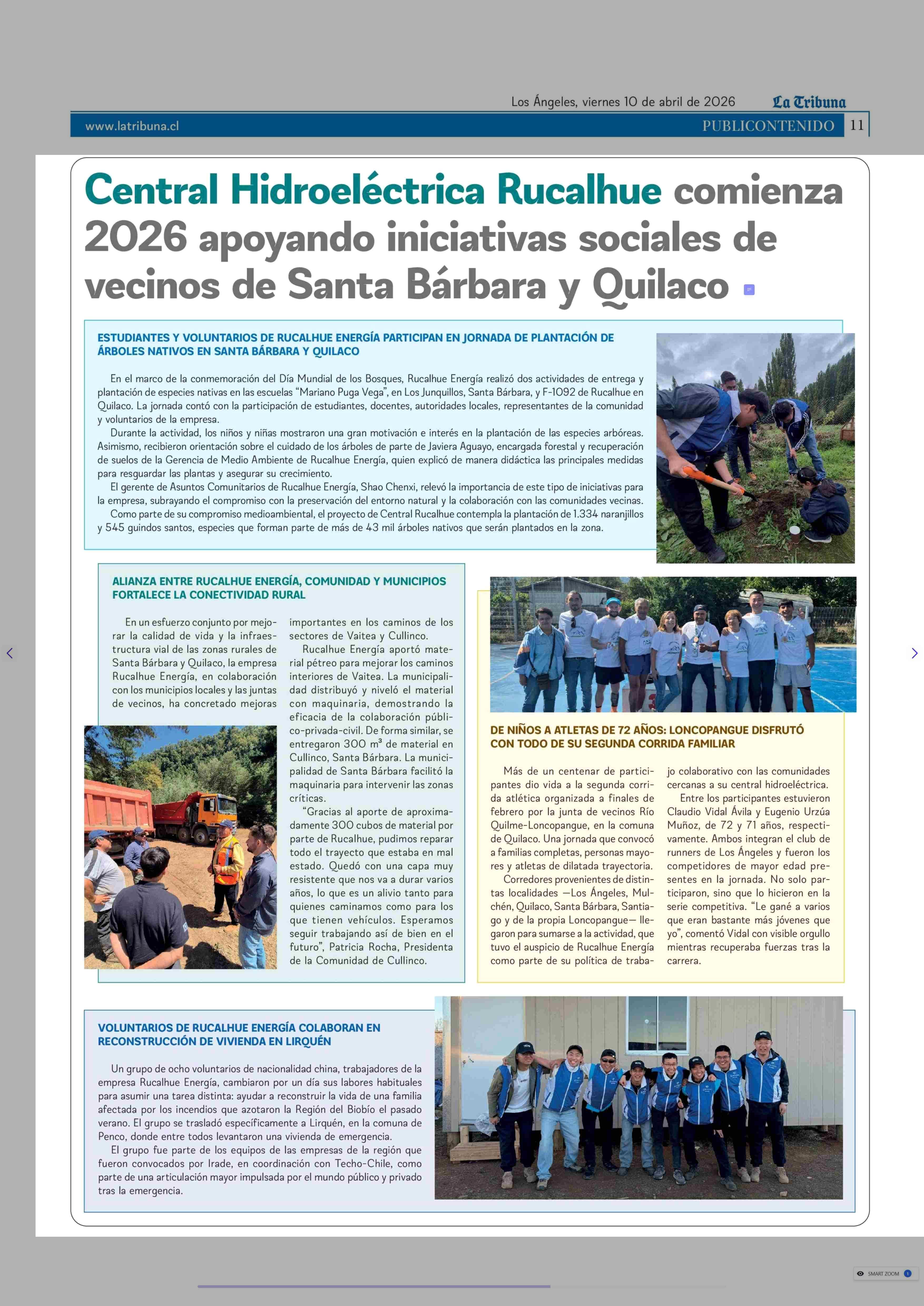 Central Hidroeléctrica Rucalhue comienza 2026 apoyando iniciativas sociales de vecinos de Santa Bárbara y Ouilaco » 10-04-2026 La Tribuna |