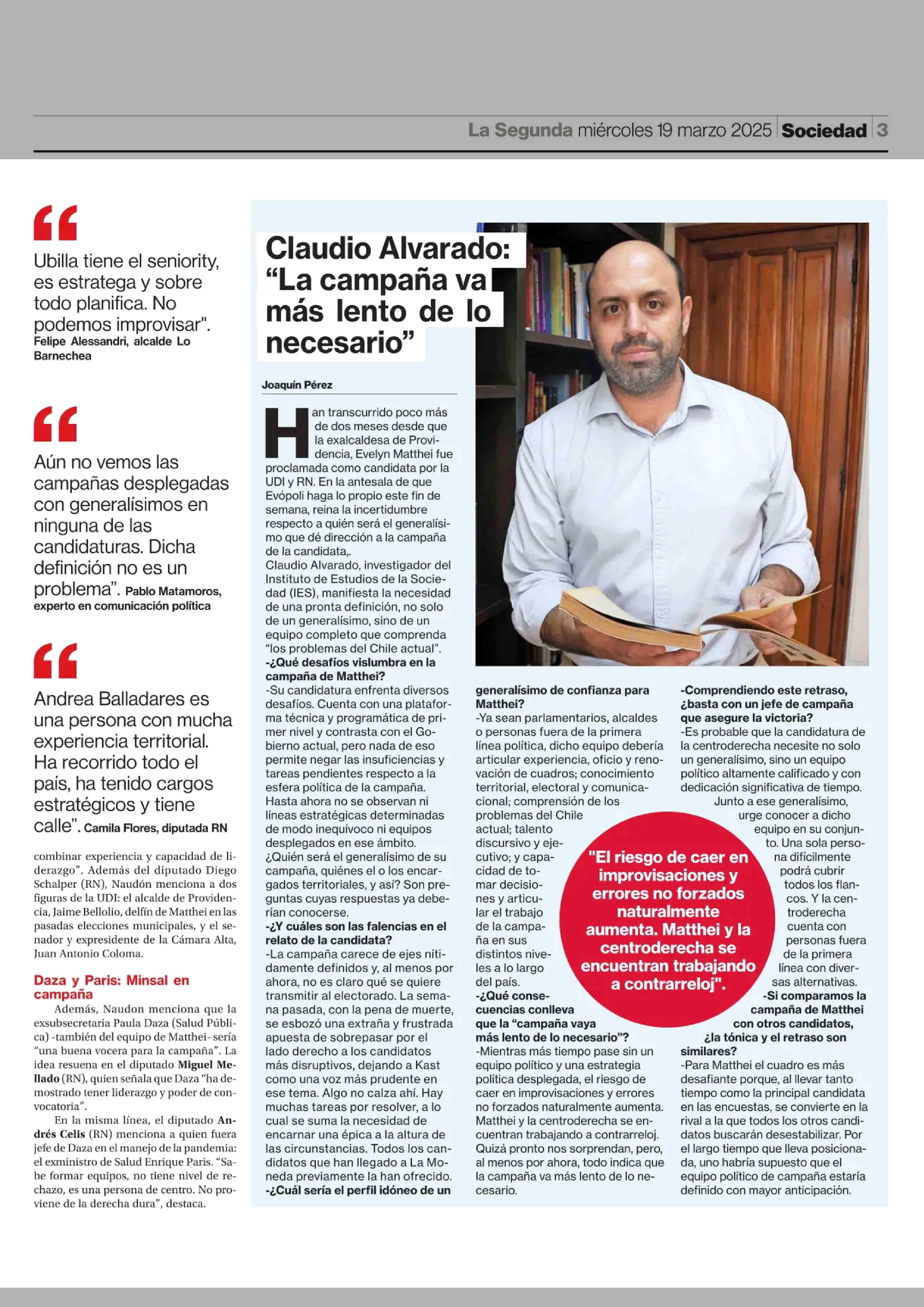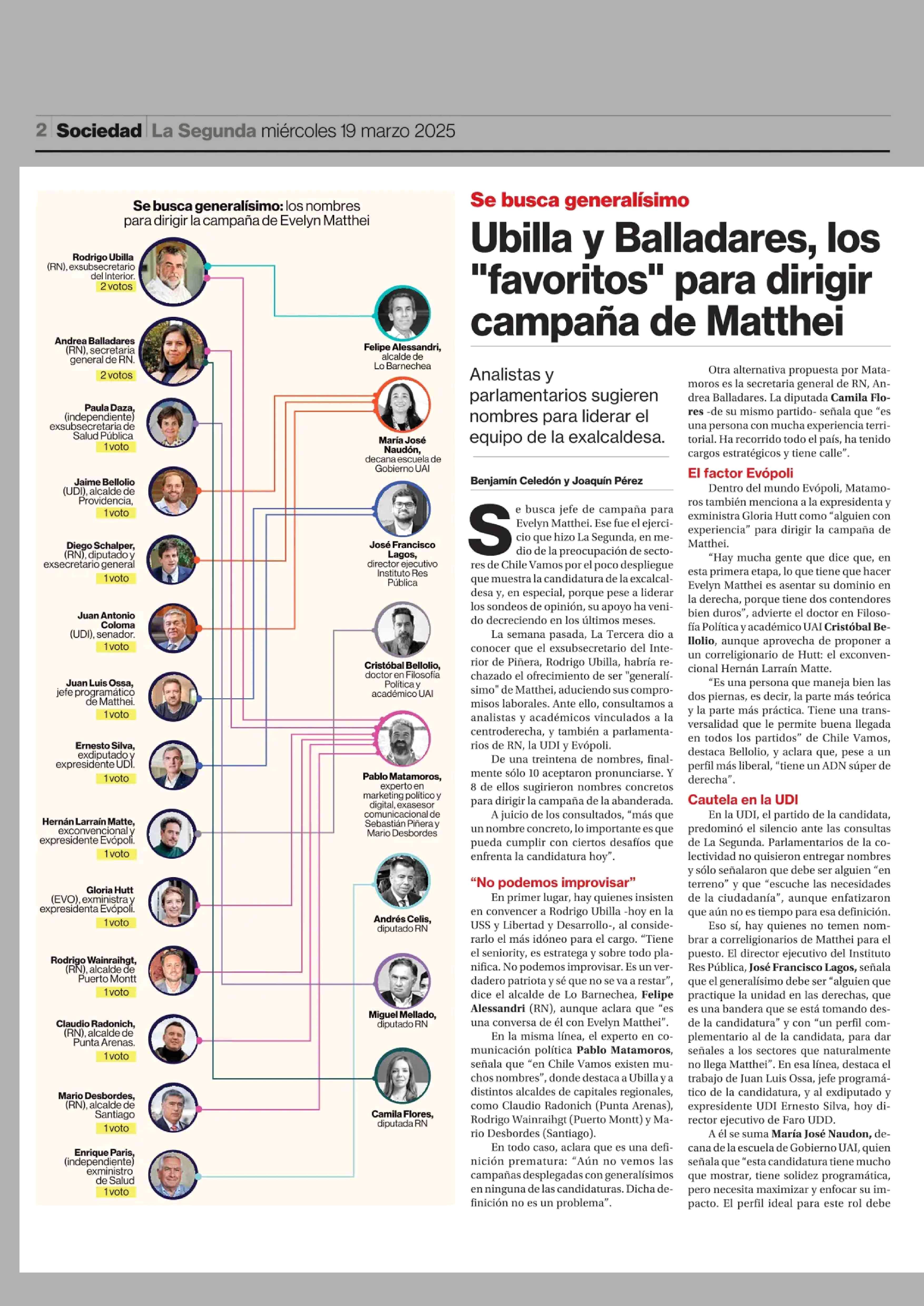 Ubilla y Balladares, los “favoritos” para dirigir campaña de Matthei 19-03-2025 La Segunda |