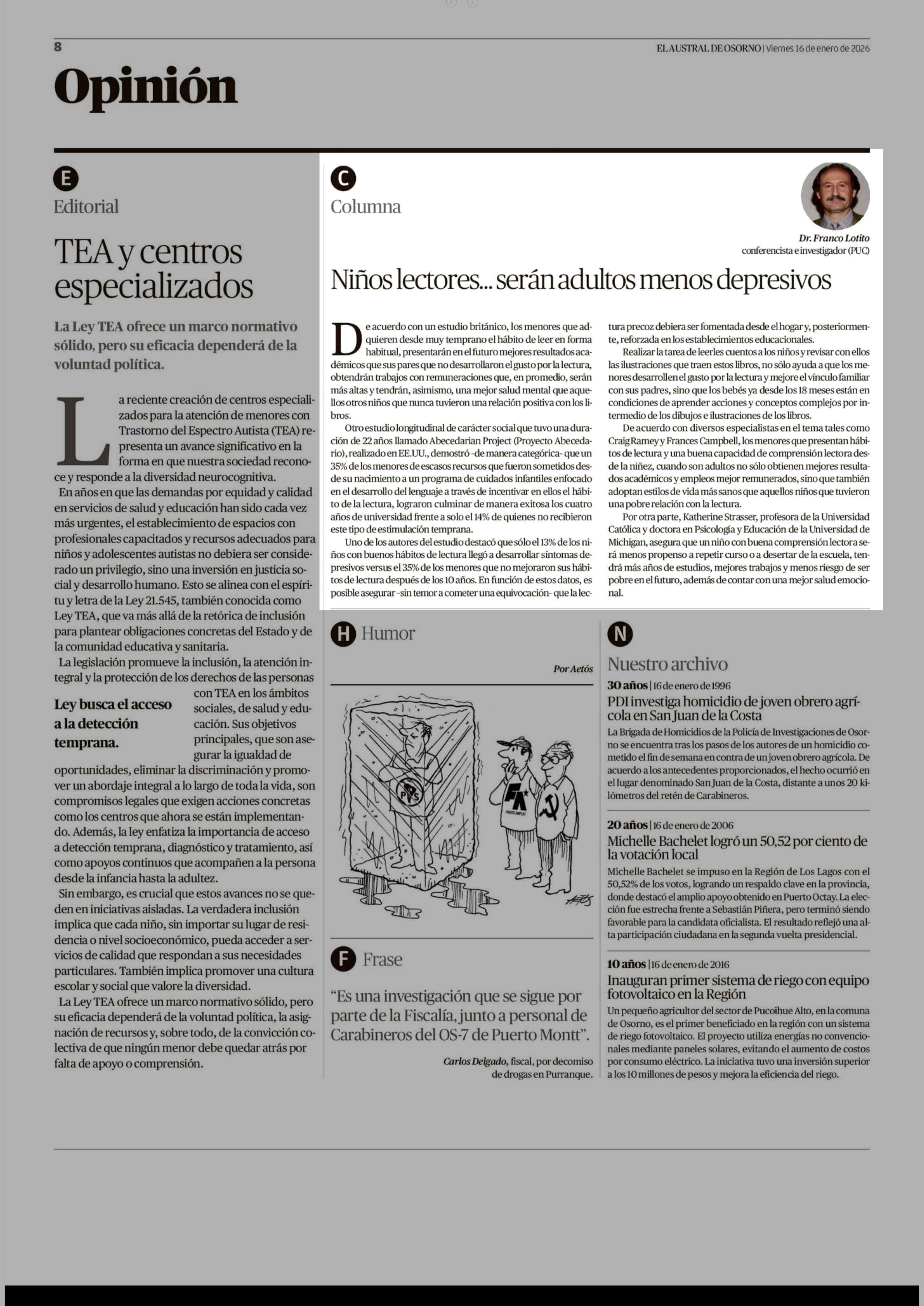 Columnas de Opinión: Niños lectores ... serán adultos menos depresivos 16-01-2026 El Austral de Osorno |