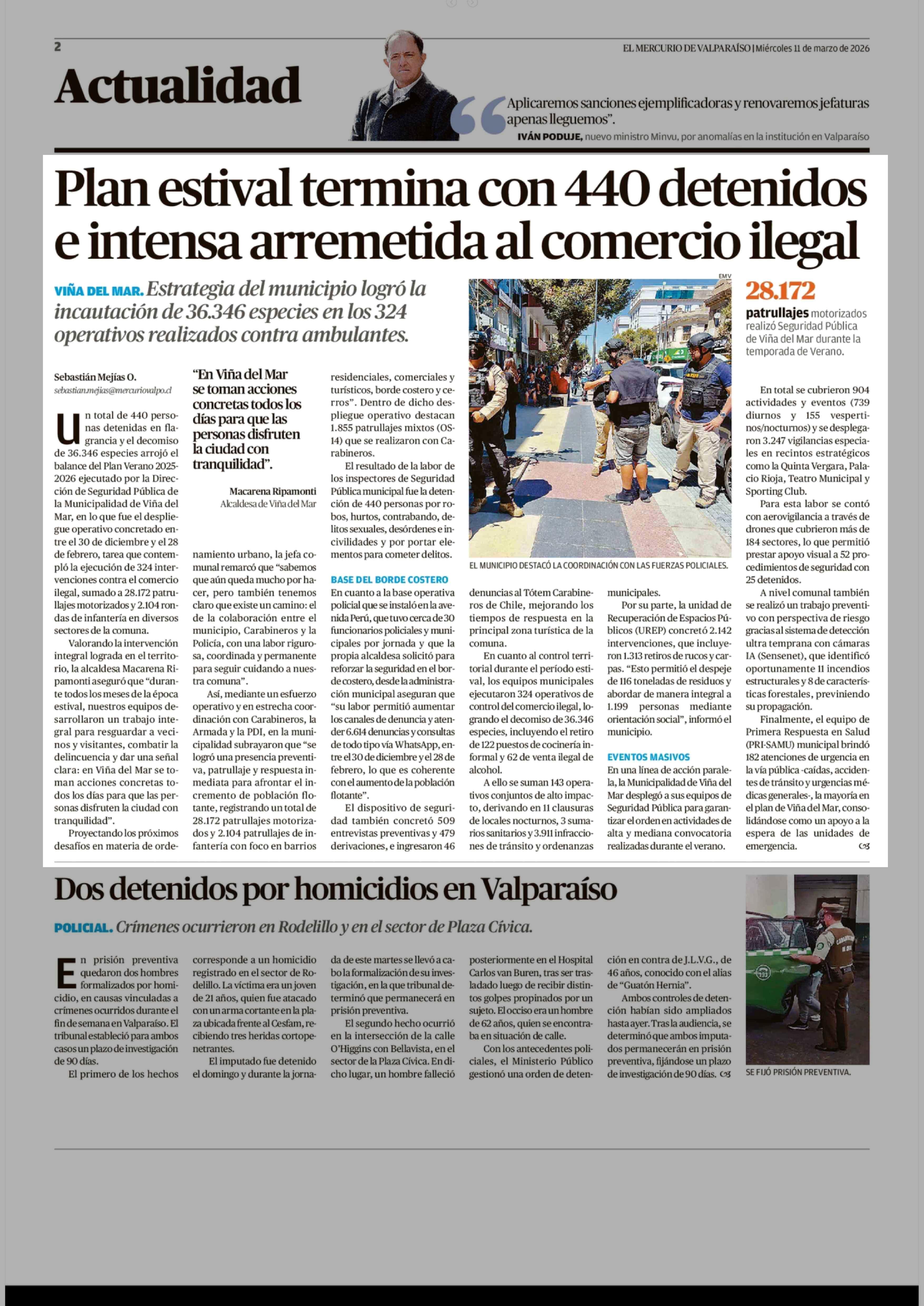 Plan estival termina con 440 detenidos e intensa arremetida al comercio ilegal 11-03-2026 El Mercurio de Valparaíso |