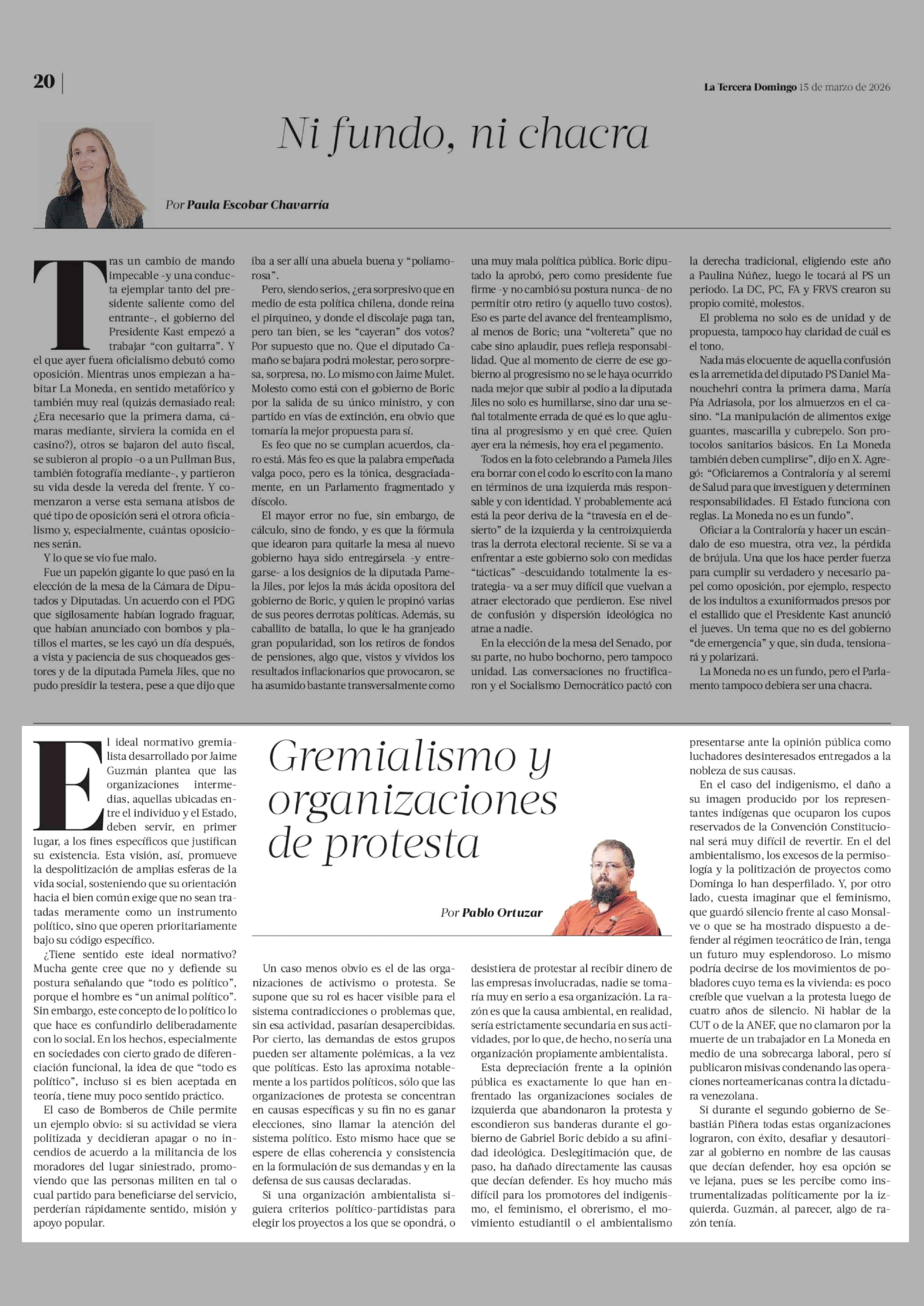 Columnas de Opinión: Gremialismo y organizaciones de protesta 15-03-2026 La Tercera |