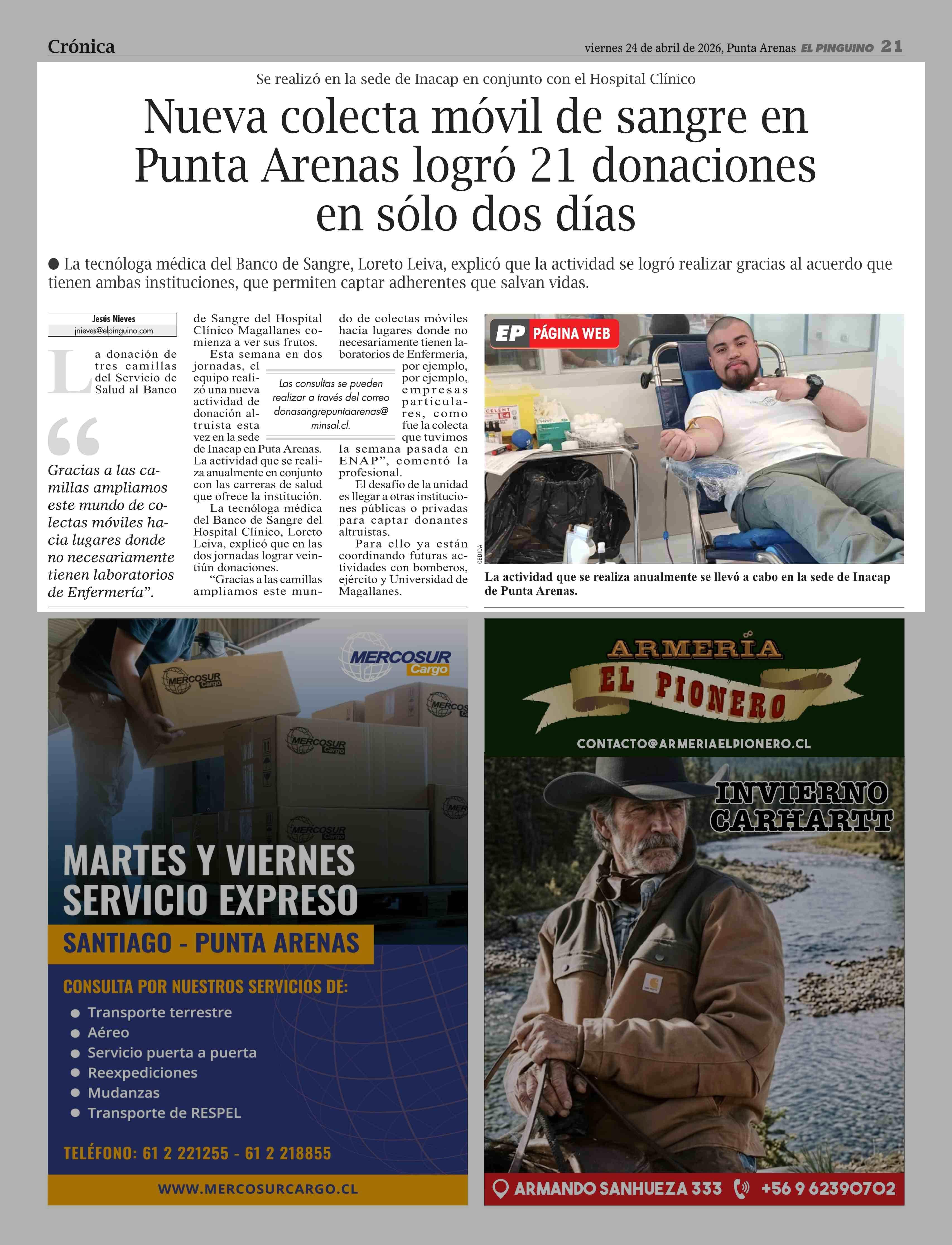 Nueva colecta móvil de sangre en Punta Arenas logró 21 donaciones en sólo dos días 24-04-2026 El Pingüino |