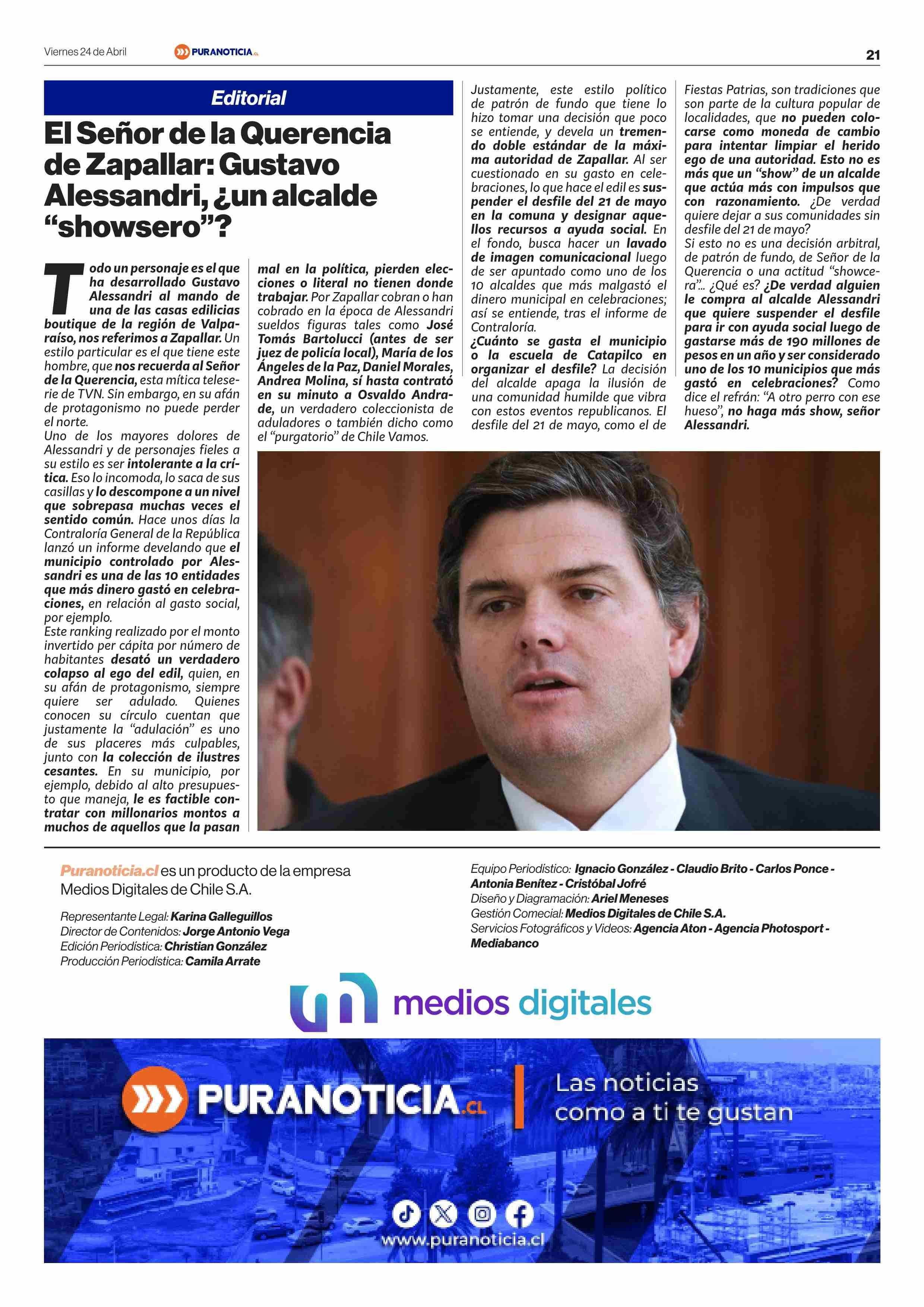 El Señor de la Querencia de Zapallar: Gustavo Alessandri, ¿un alcalde "showsero"? 24-04-2026 Puranoticia.cl |