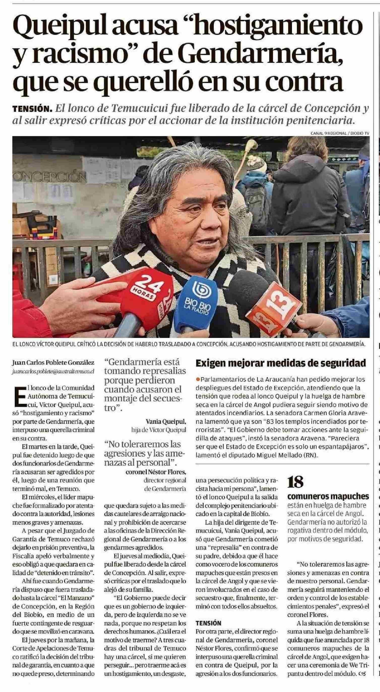 Queipul acusa "hostigamiento y racismo" de Gendarmería, que se querello en su contra 14-06-2025 El Austral de la Araucanía |