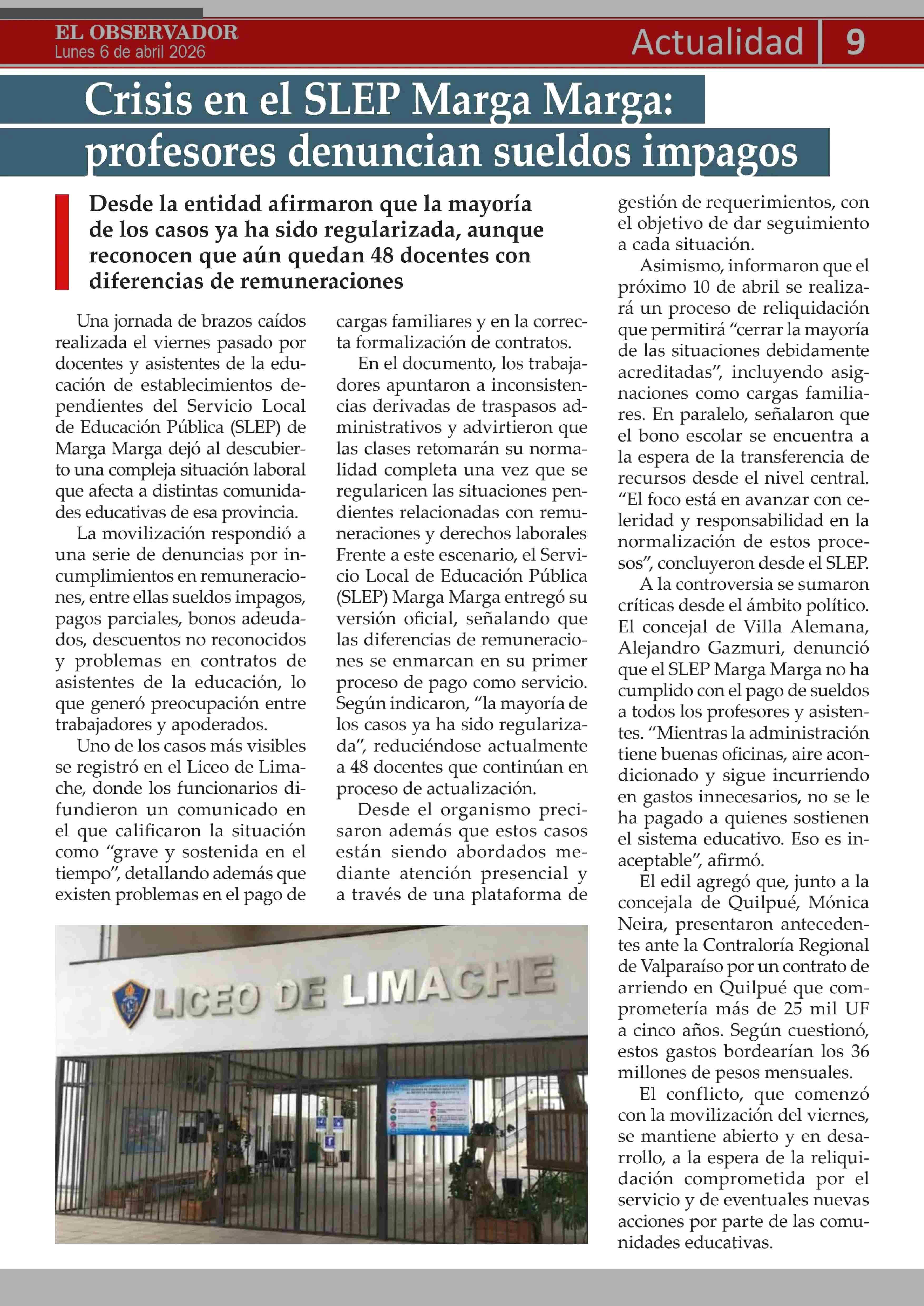 Crisis en el SLEP Marga Marga: profesores denuncian sueldos impagos 06-04-2026 El Observador Vespertino |