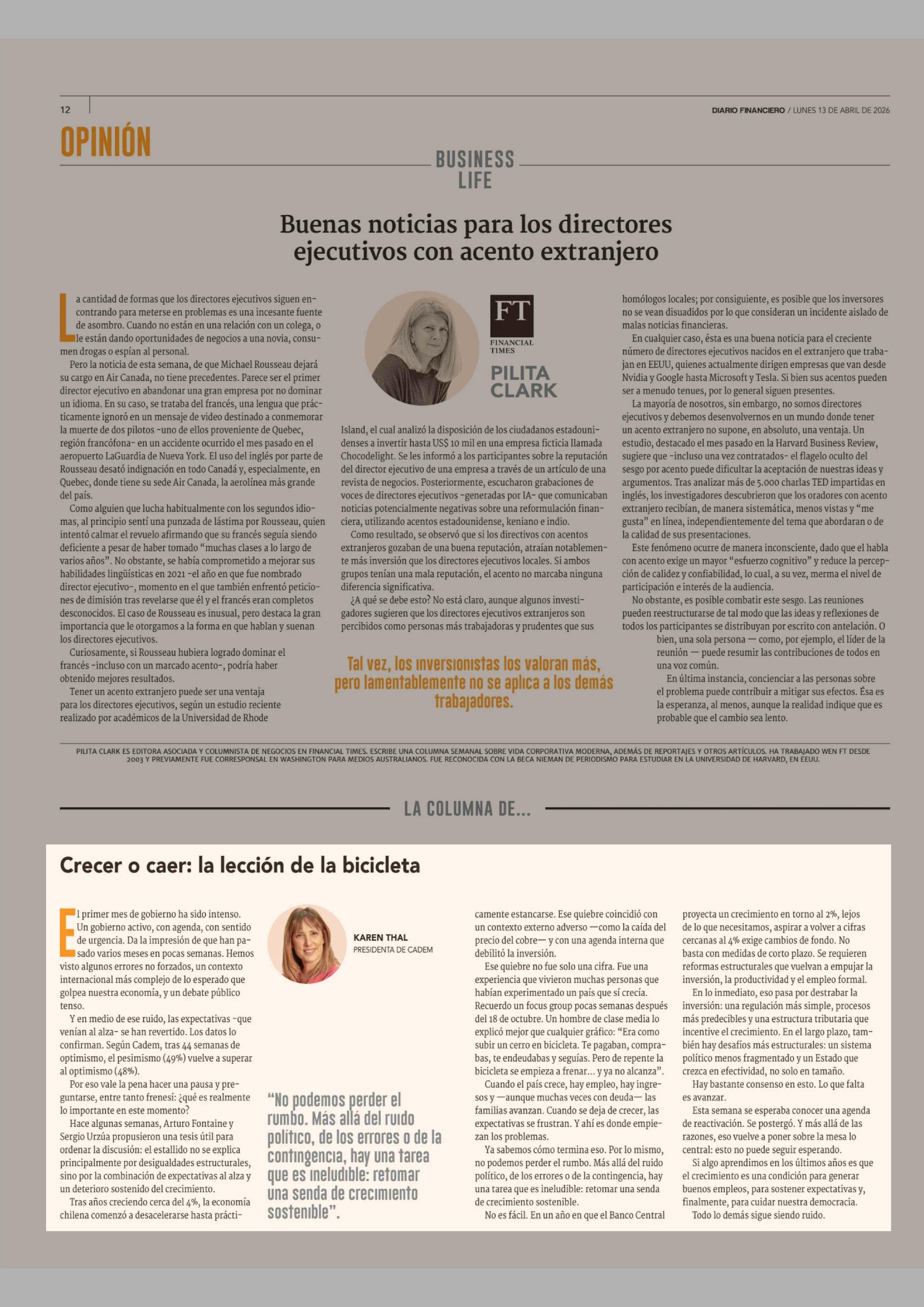 Columnas de Opinión: Crecer o caer: la lección de la bicicleta 13-04-2026 Diario Financiero |
