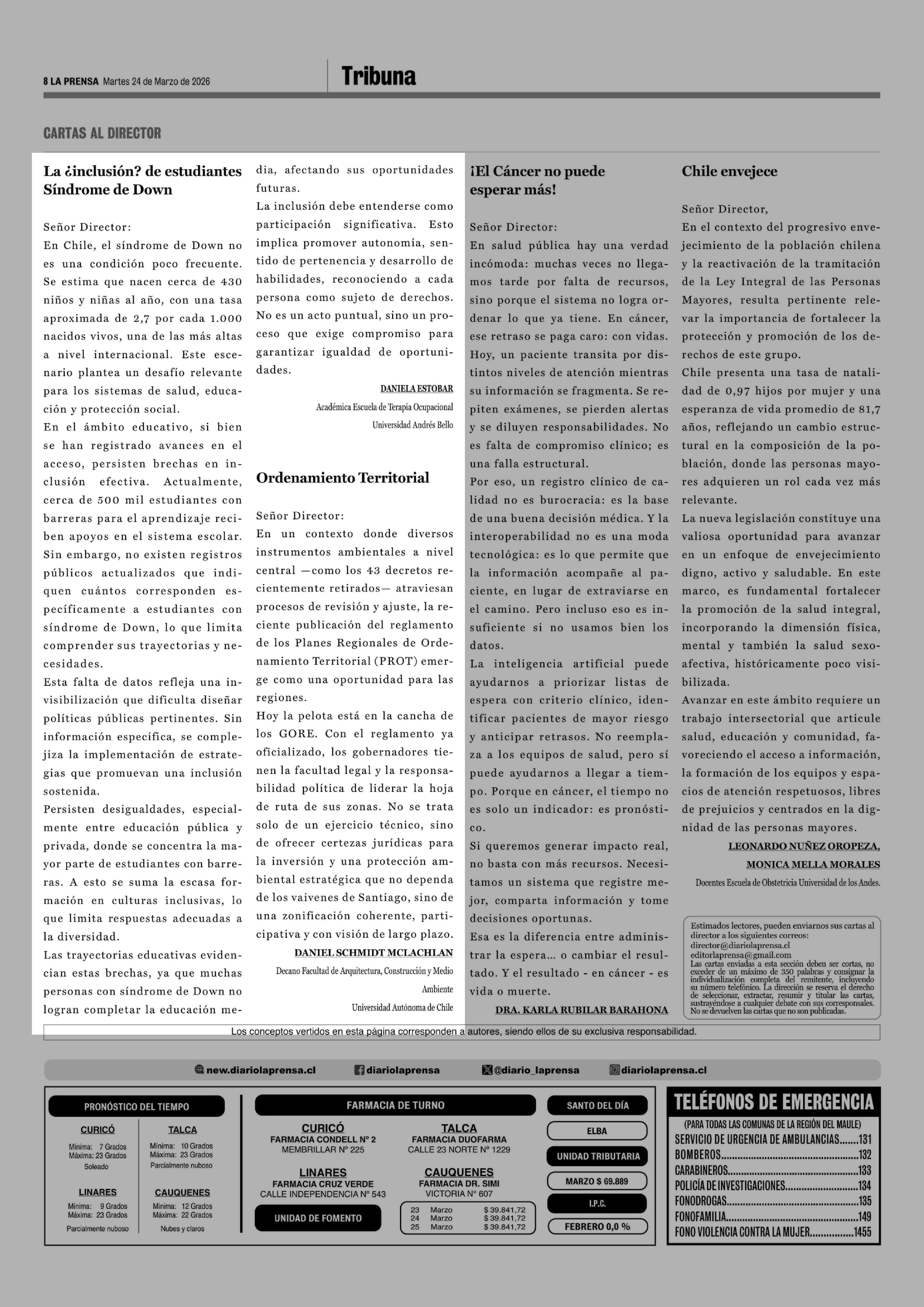 Cartas: La ¿inclusión? de estudiantes Síndrome de Down 24-03-2026 La Prensa de Curicó |