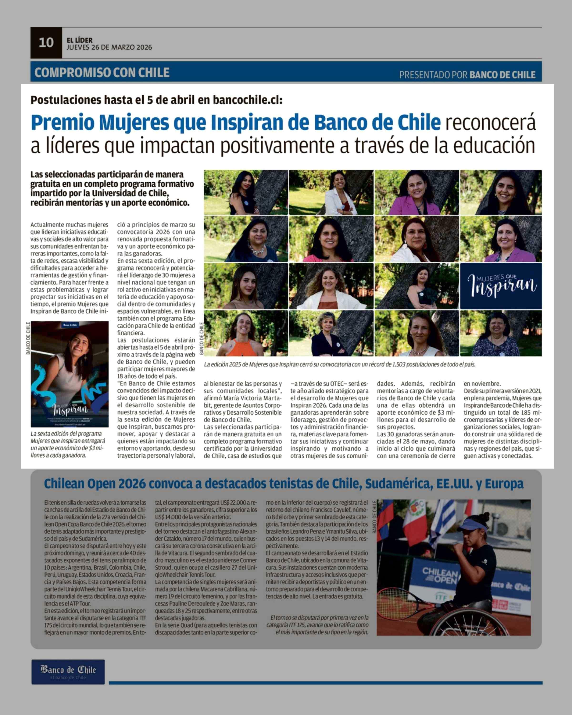 Título: Premio Mujeres que Inspiran de Banco de Chile reconocerá a líderes que impactan positivamente a través de la educación