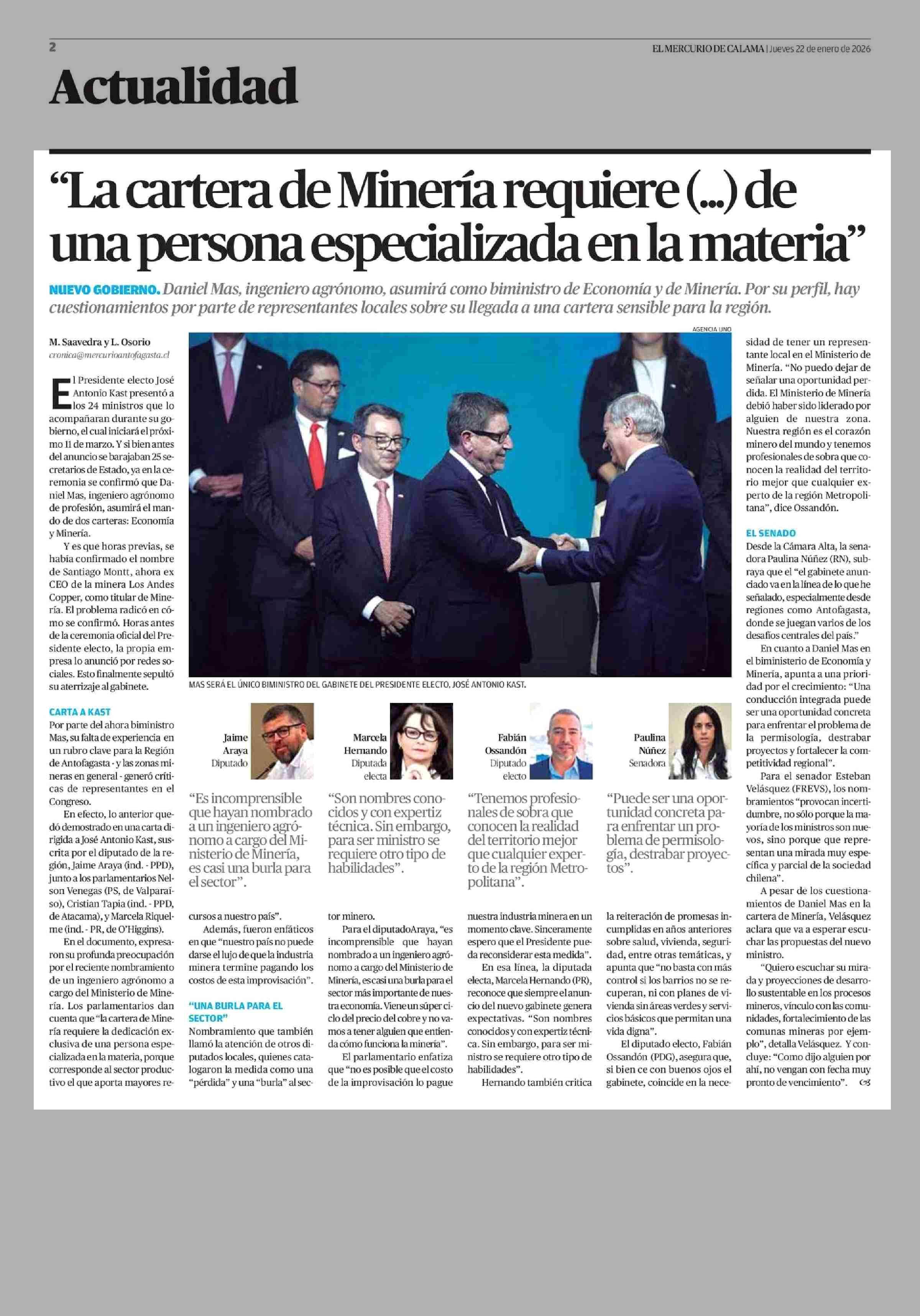 "La cartera de Minería requiere ( ... ) de una persona especializada en la materia" 22-01-2026 El Mercurio de Calama |