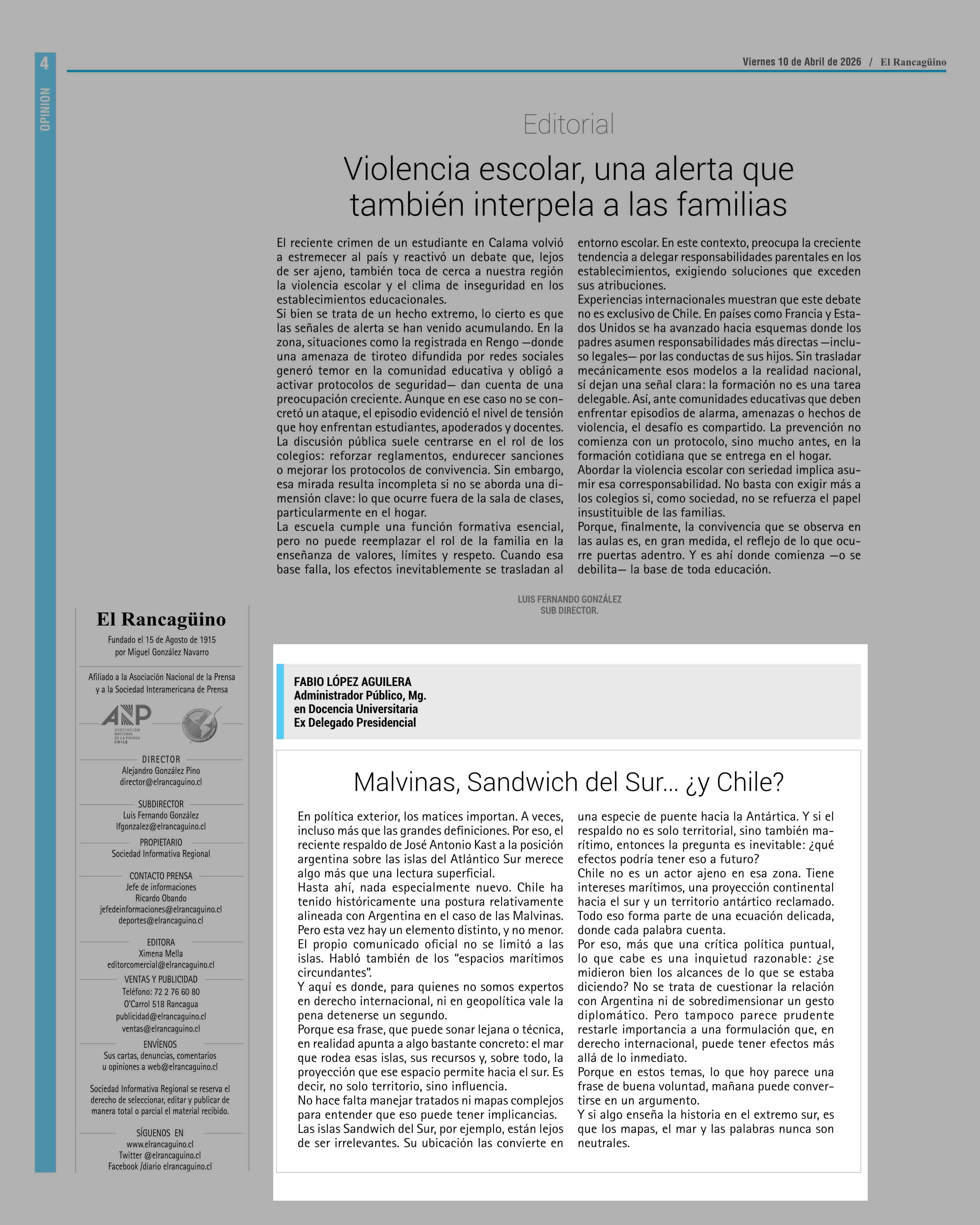 COLUMNAS DE OPINIÓN: Malvinas, Sandwich del Sur... ¿y Chile? 10-04-2026 El Rancagüino |