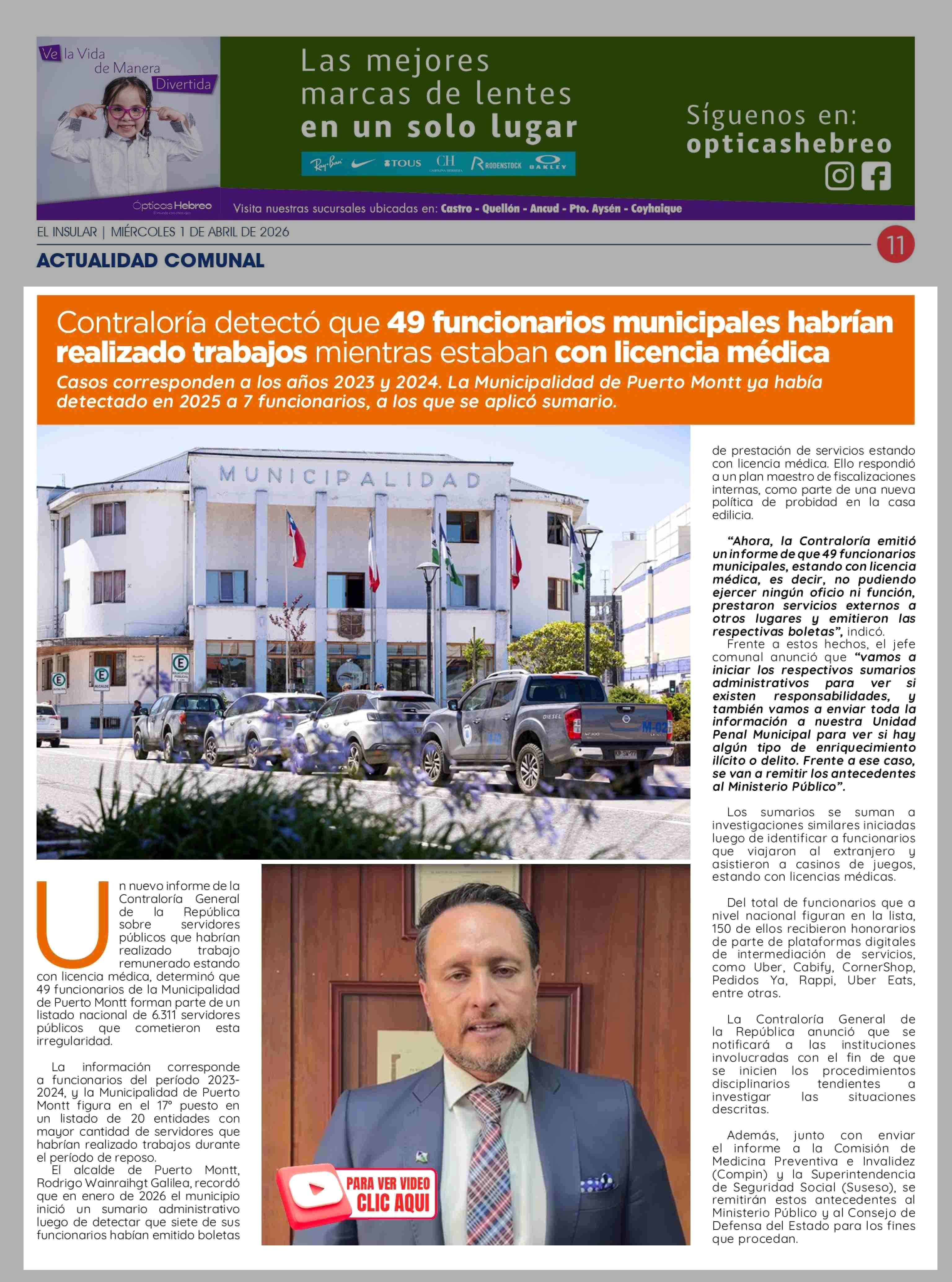 Contraloría detectó que 49 funcionarios municipales habrían realizado trabajos mientras estaban con licencia médica 01-04-2026 El Insular |