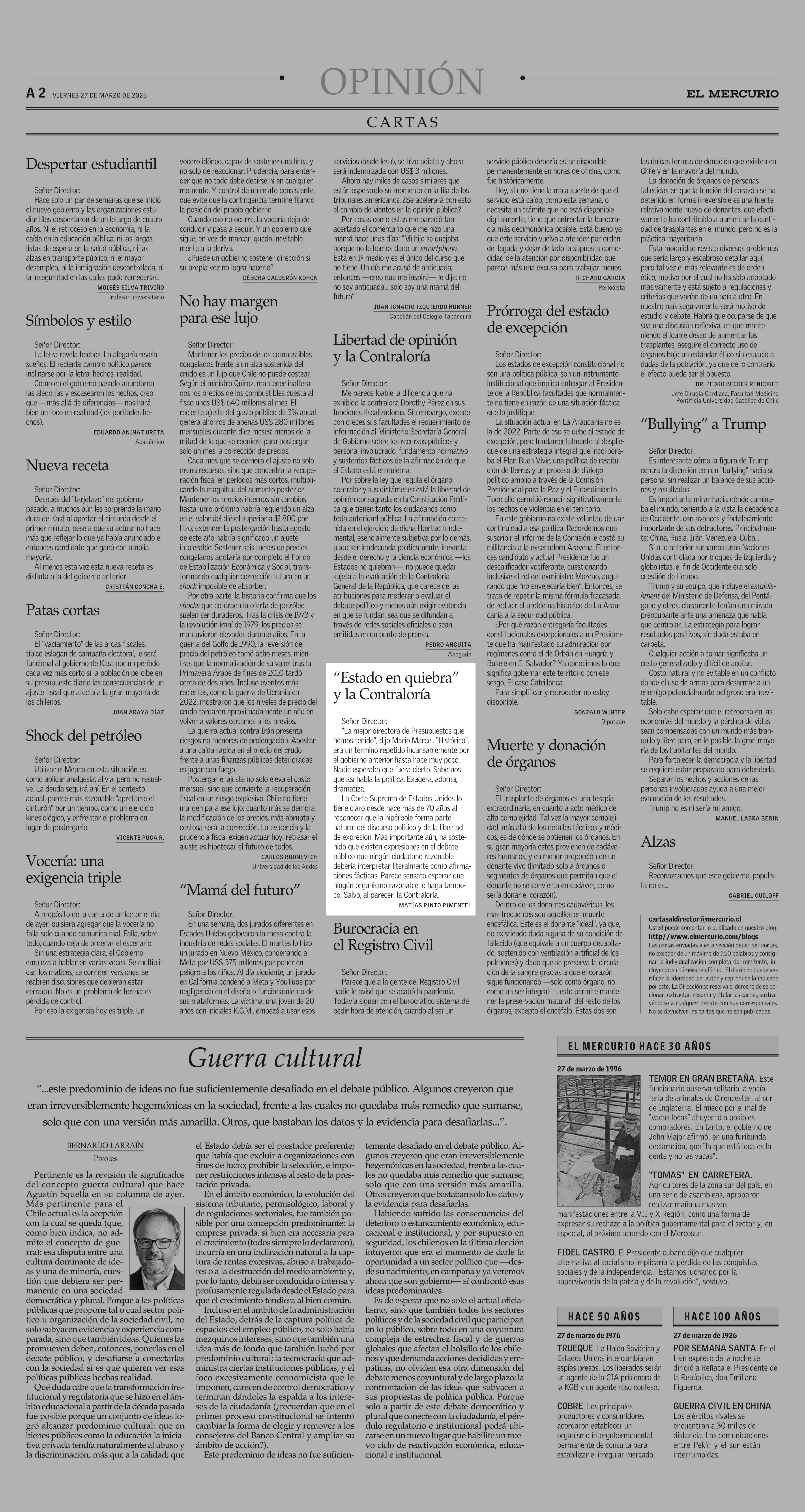 Cartas: “Estado en quiebra” y la Contraloría 27-03-2026 El Mercurio |