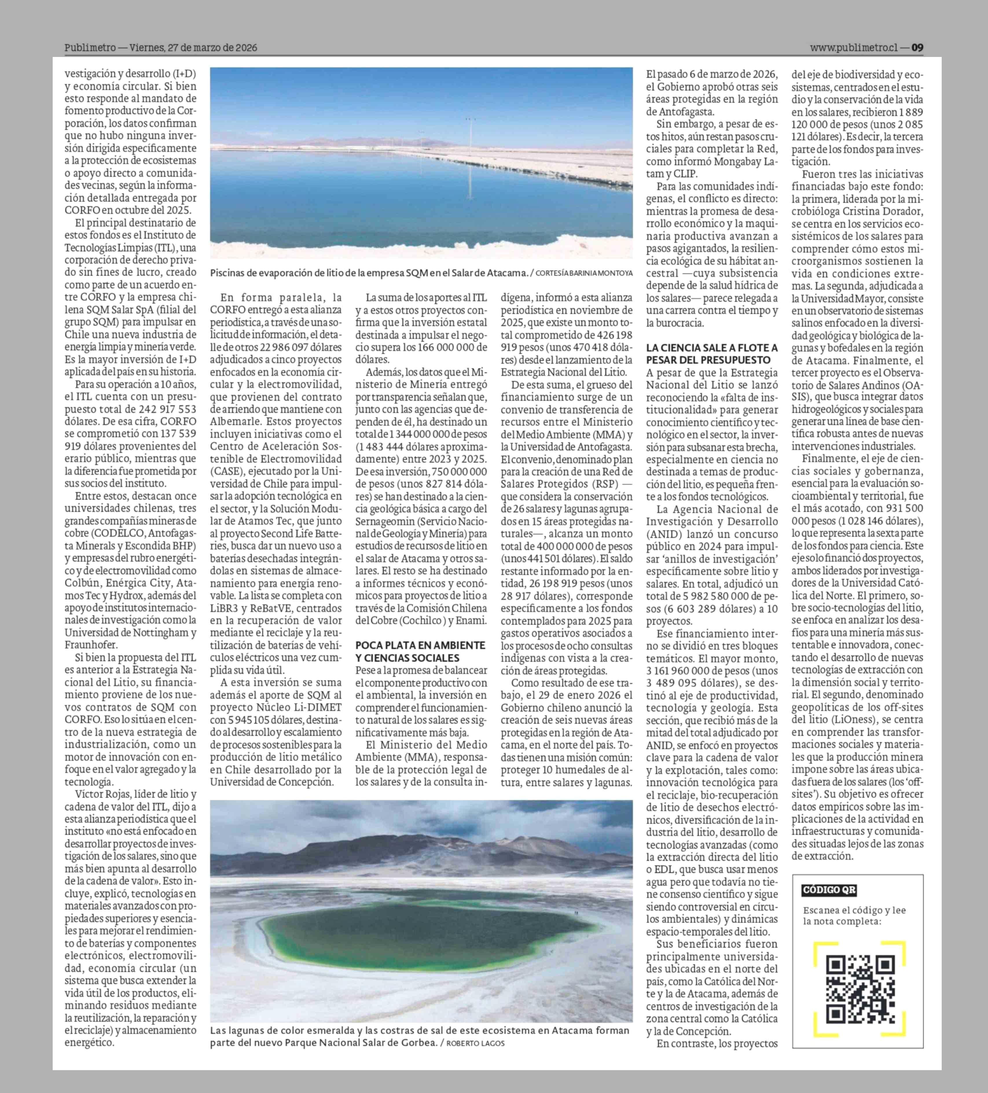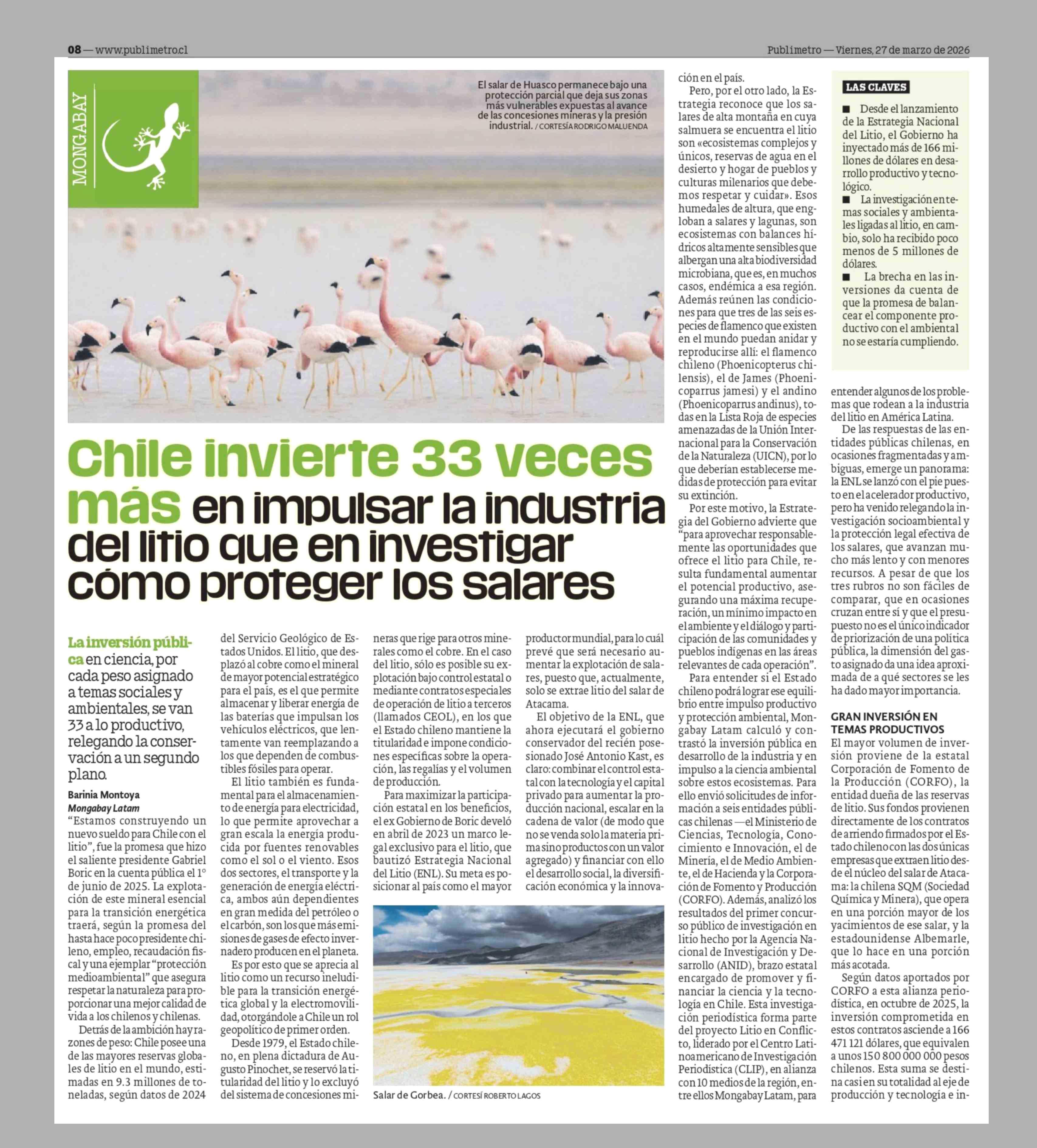 Título: Chile invierte 33 veces más en impulsar la industria del litio que en investigar como proteger los salares