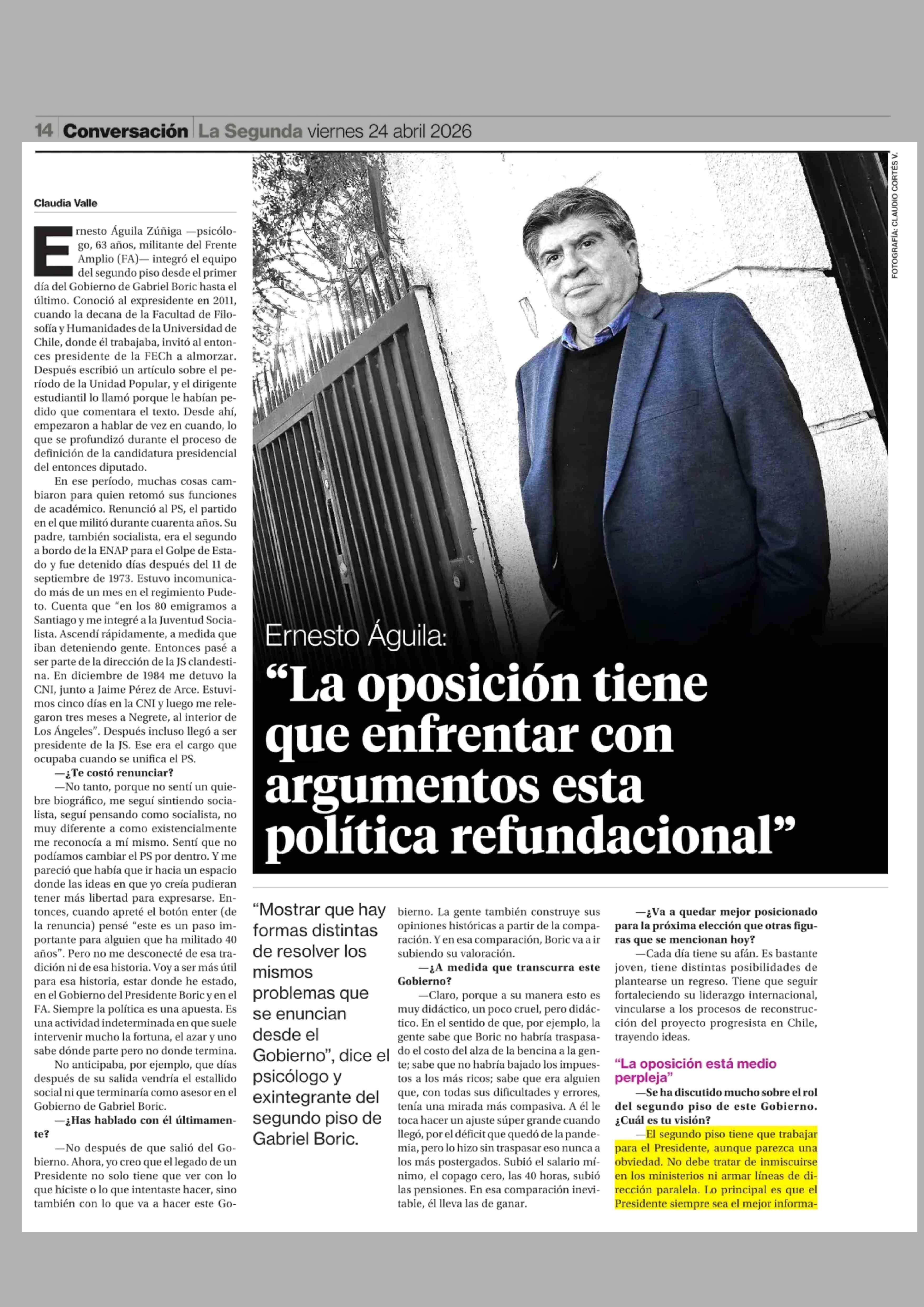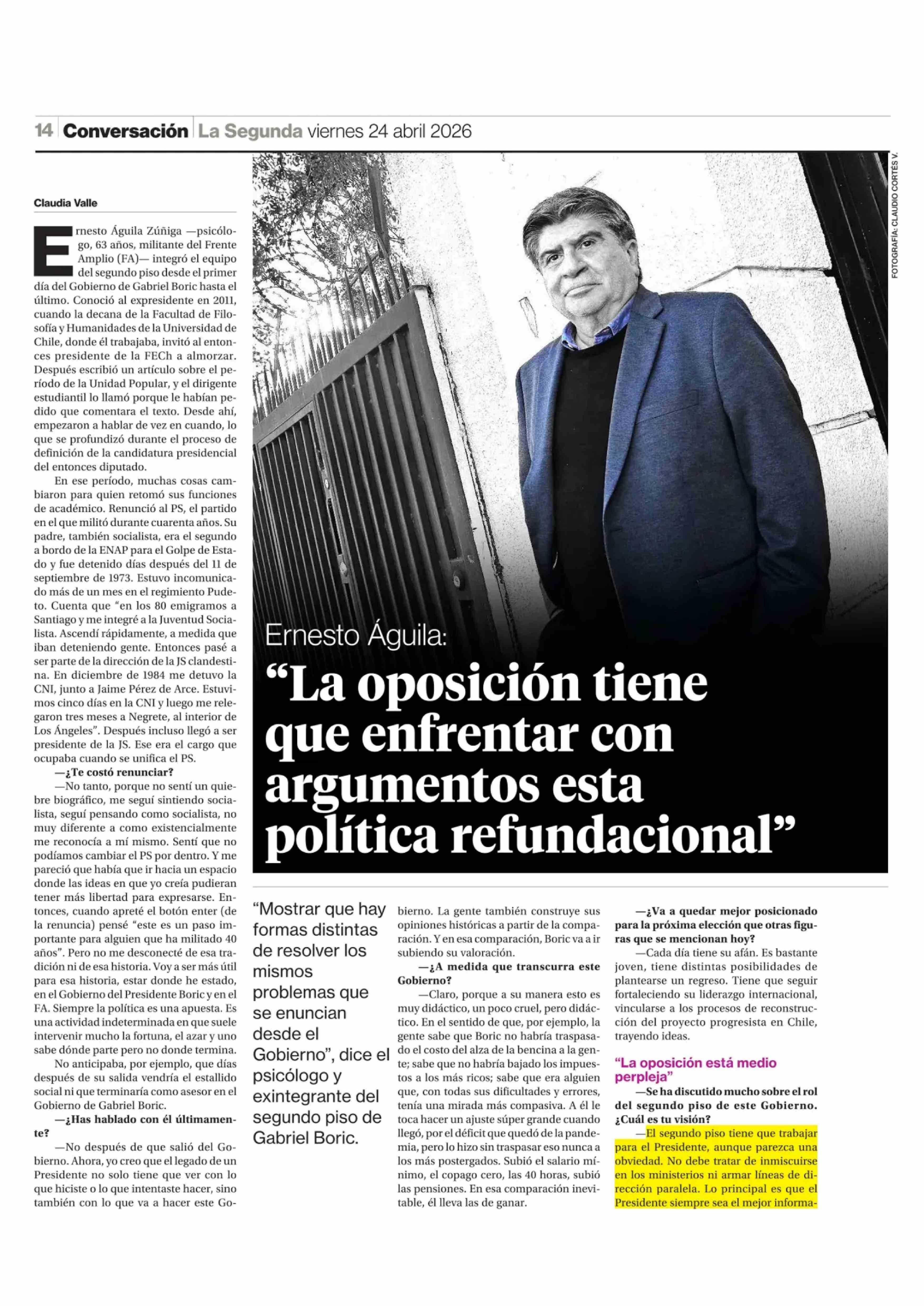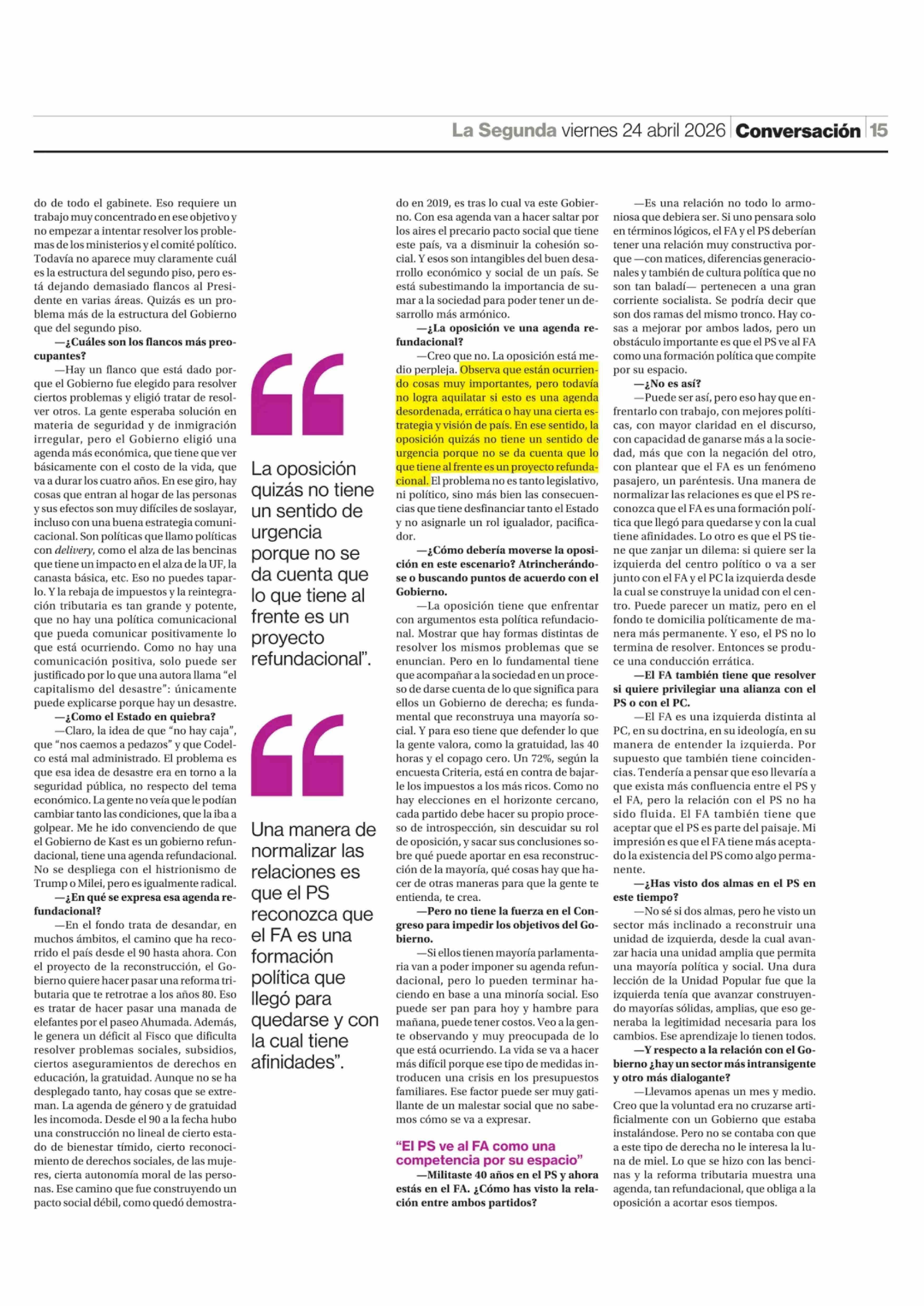 "La oposición tiene que enfrentar con argumentos esta política refundacional" 24-04-2026 La Segunda |