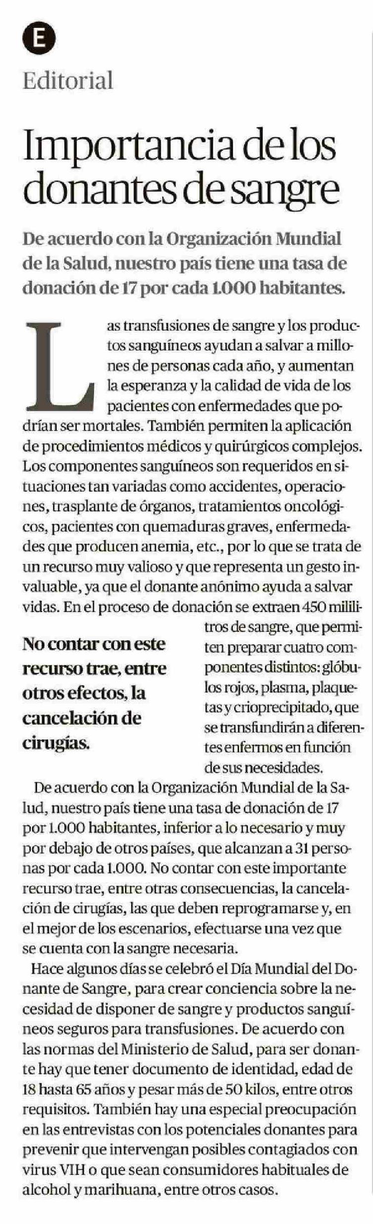 | Título: | Editorial: Importancia de los donantes de sangre |