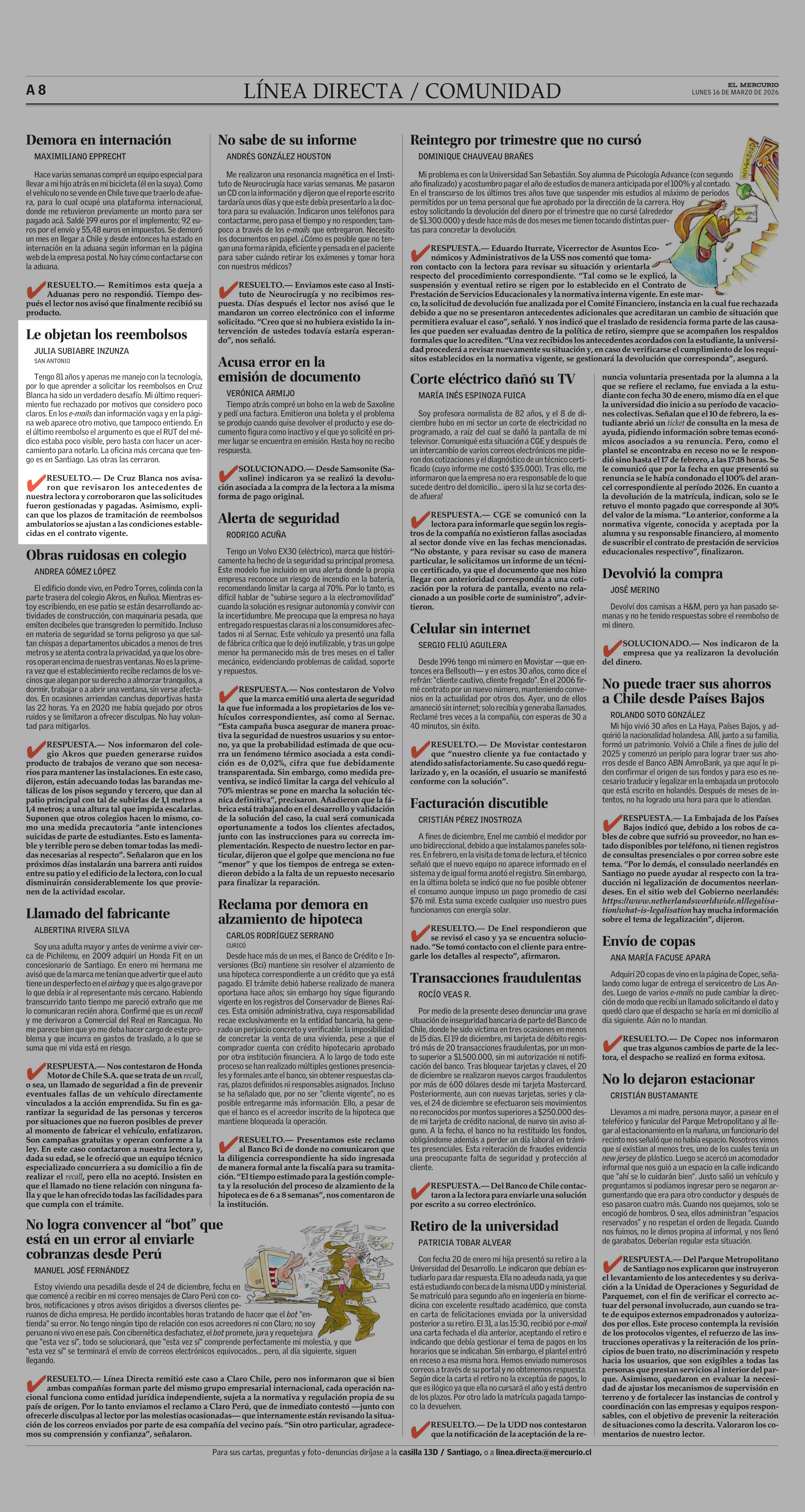 Cartas: Le objetan los reembolsos 16-03-2026 El Mercurio |