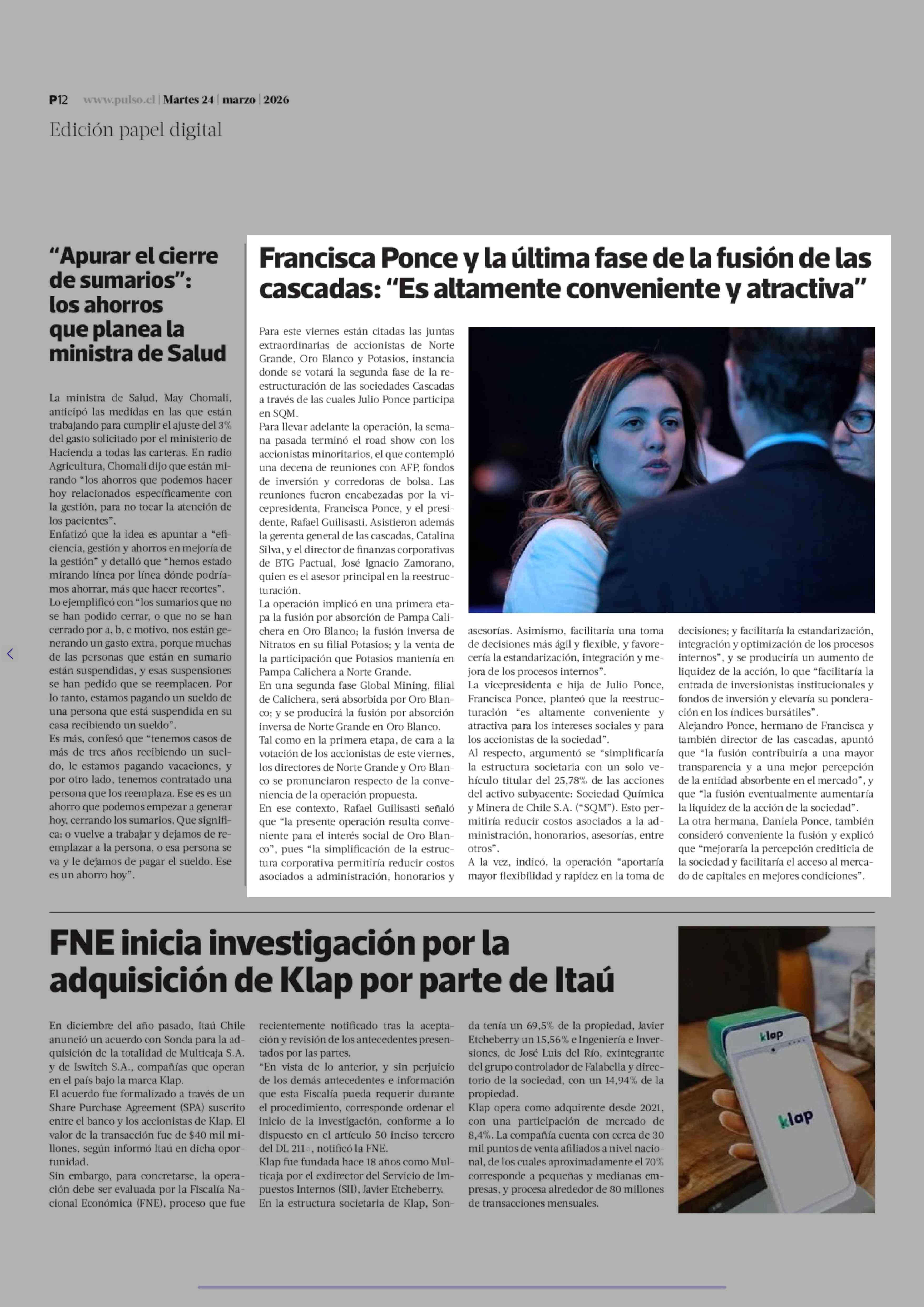 Francisca Ponce y la última fase de la fusión de las cascadas: "Es altamente conveniente y atractiva" 24-03-2026 La Tercera |