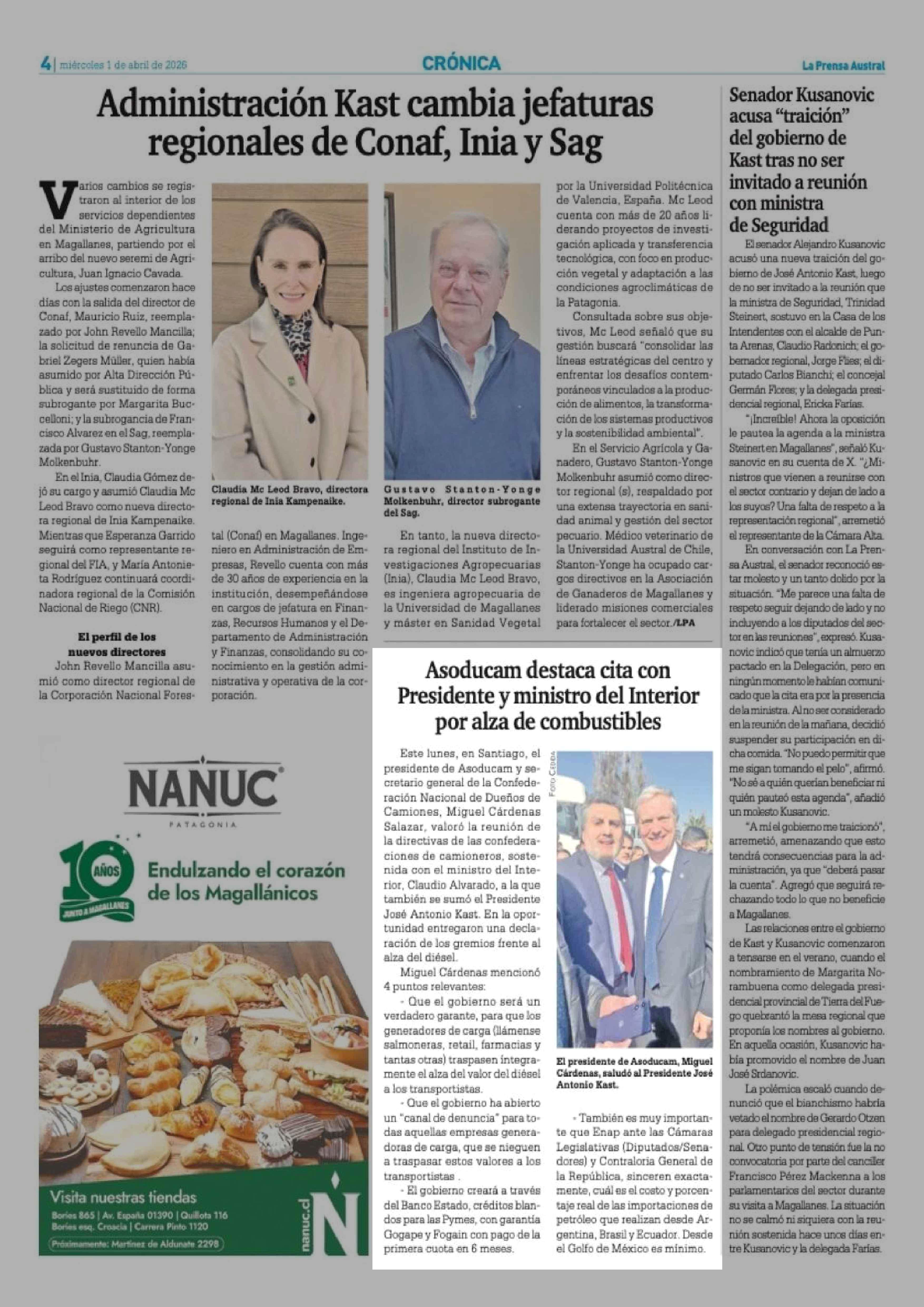 Asoducam destaca cita con Presidente y ministro del Interior por alza de combustibles 01-04-2026 La Prensa Austral |