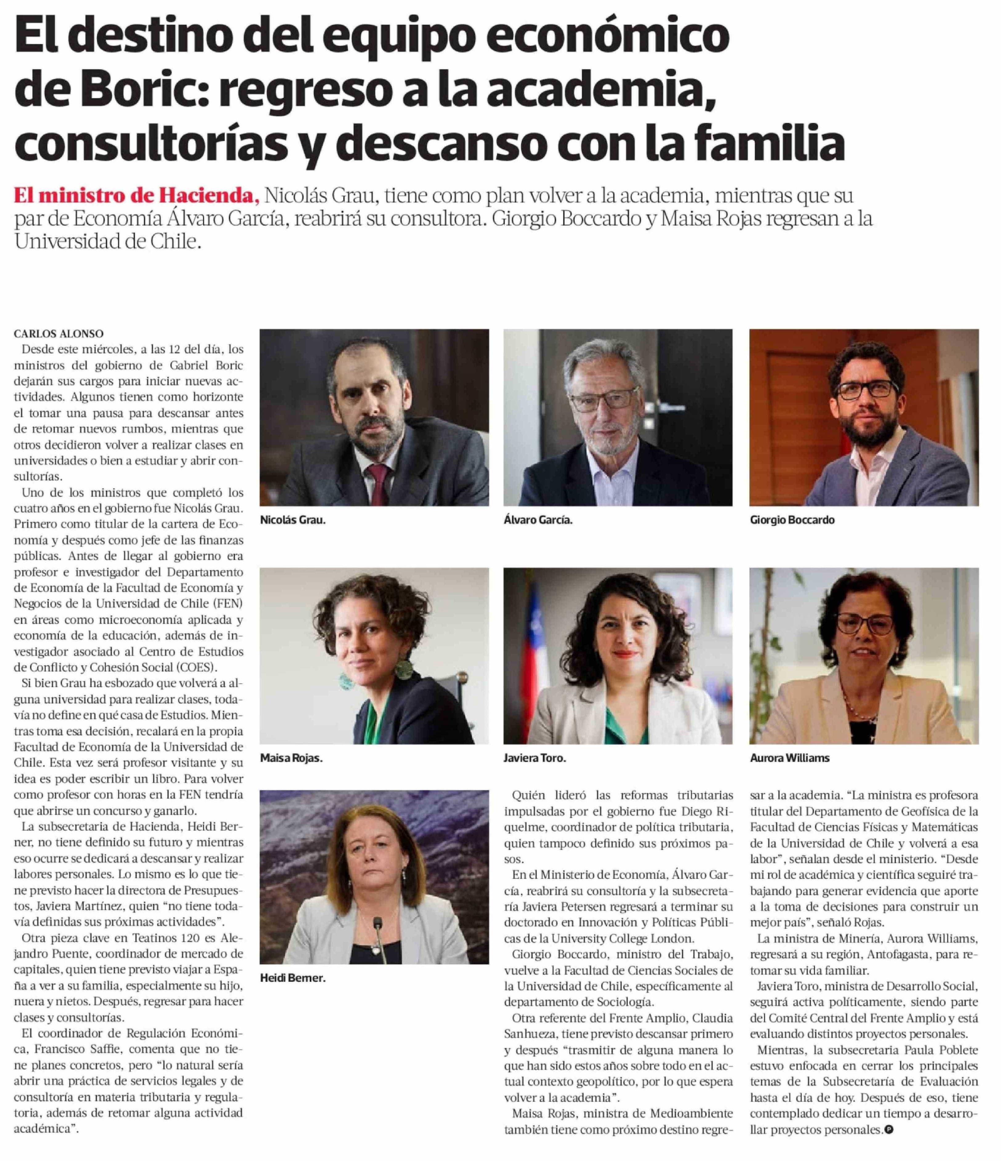 El destino del equipo económico de Boric: regreso a la academia, consultorías y descanso con la familia 11-03-2026 La Tercera |