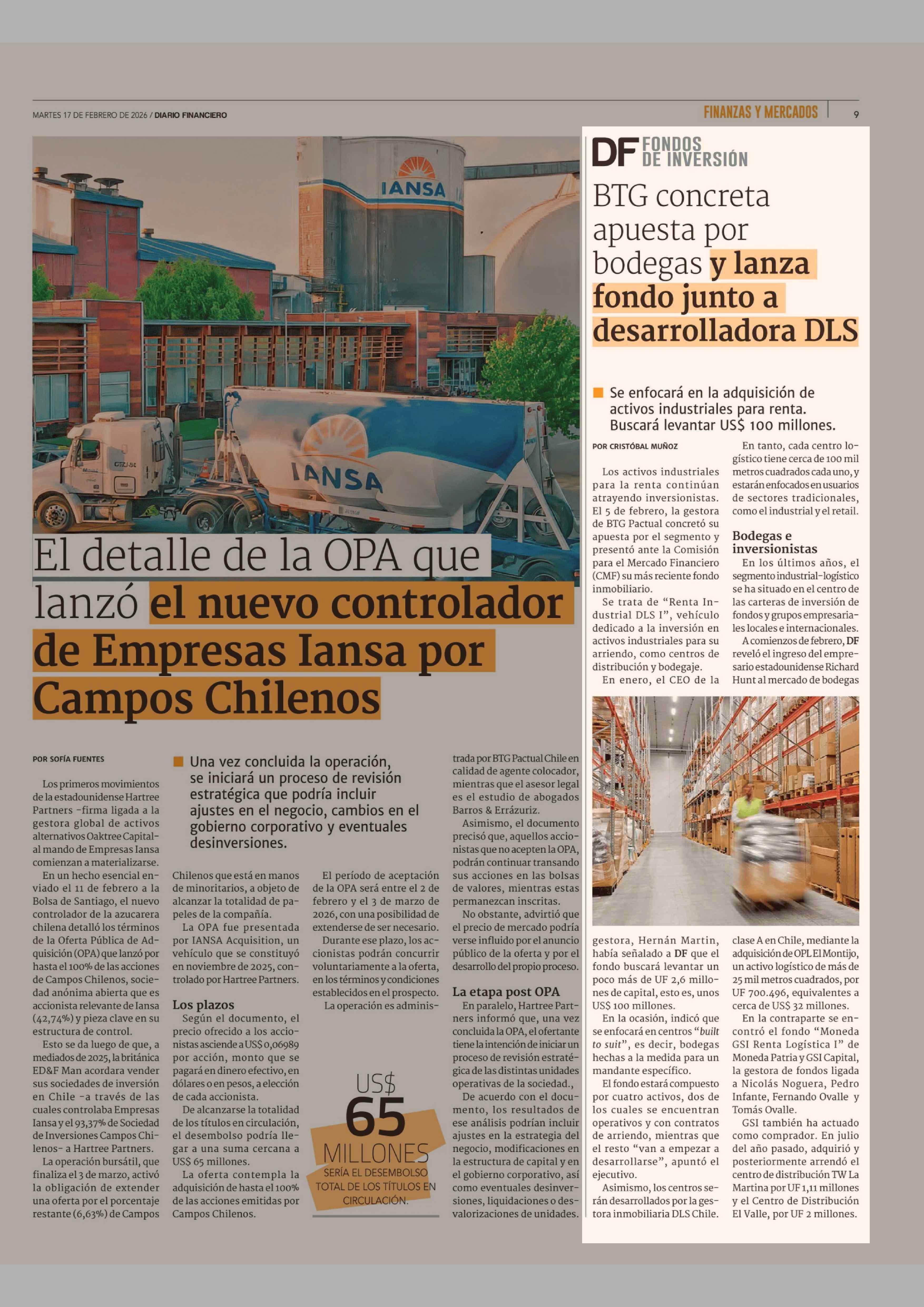 BTG concreta apuesta por bodegas y lanza fondo junto a desarrolladora DLS 17-02-2026 Diario Financiero |