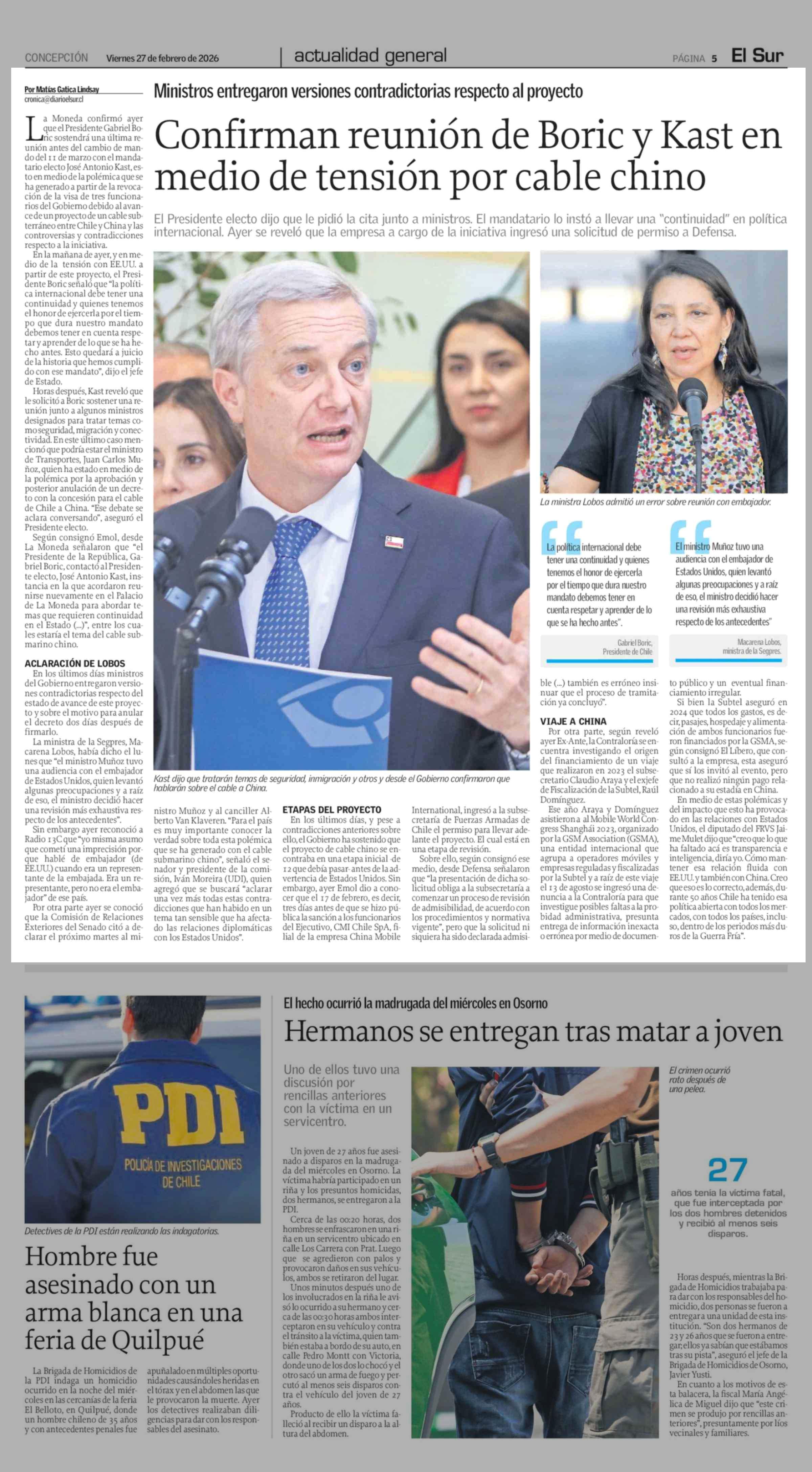 Confirman reunión de Boric y Kast en medio de tensión por cable chino 27-02-2026 El Sur |