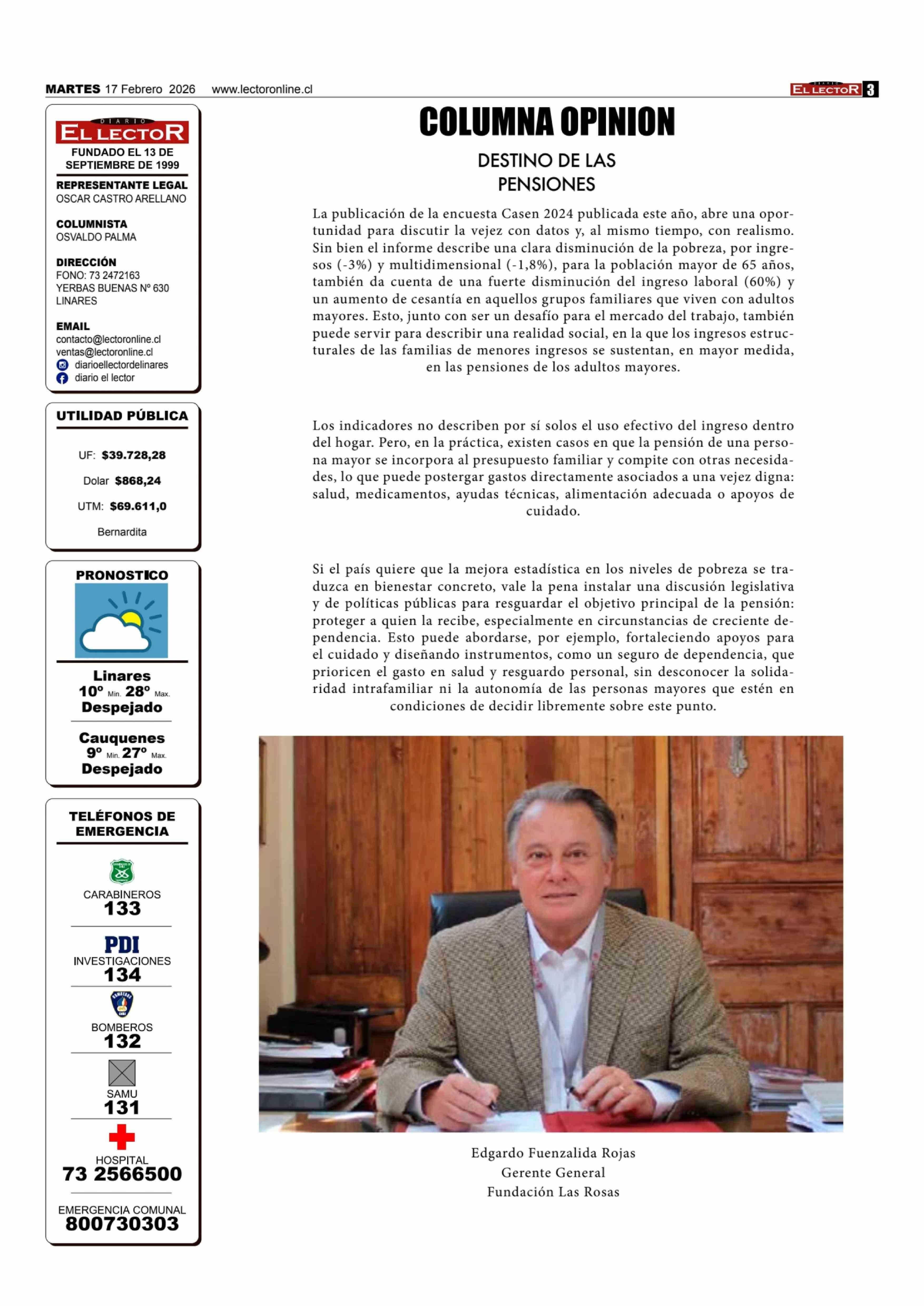 Columnas de Opinión: DESTINO DE LAS PENSIONES 18-02-2026 El Lector |
