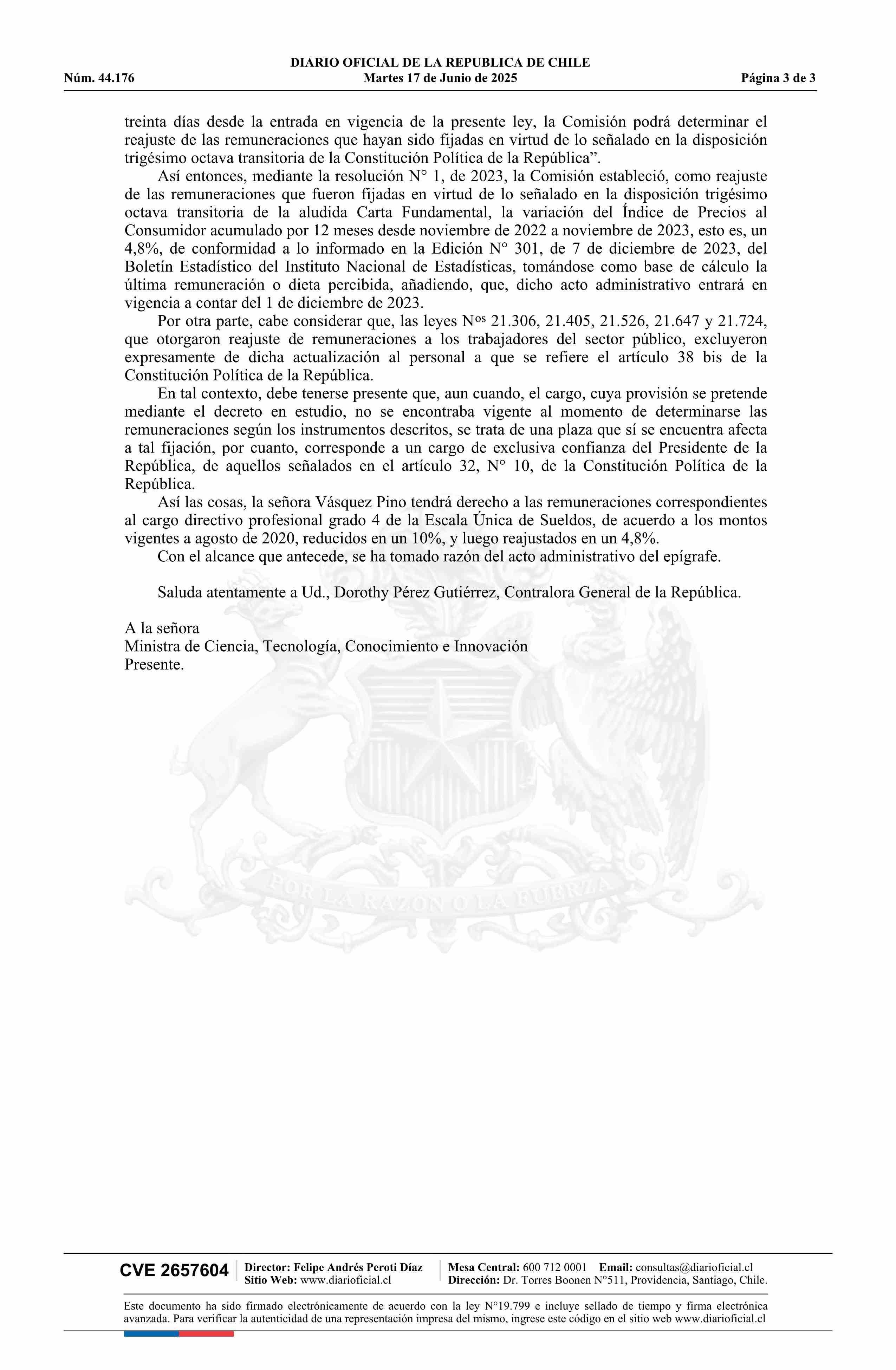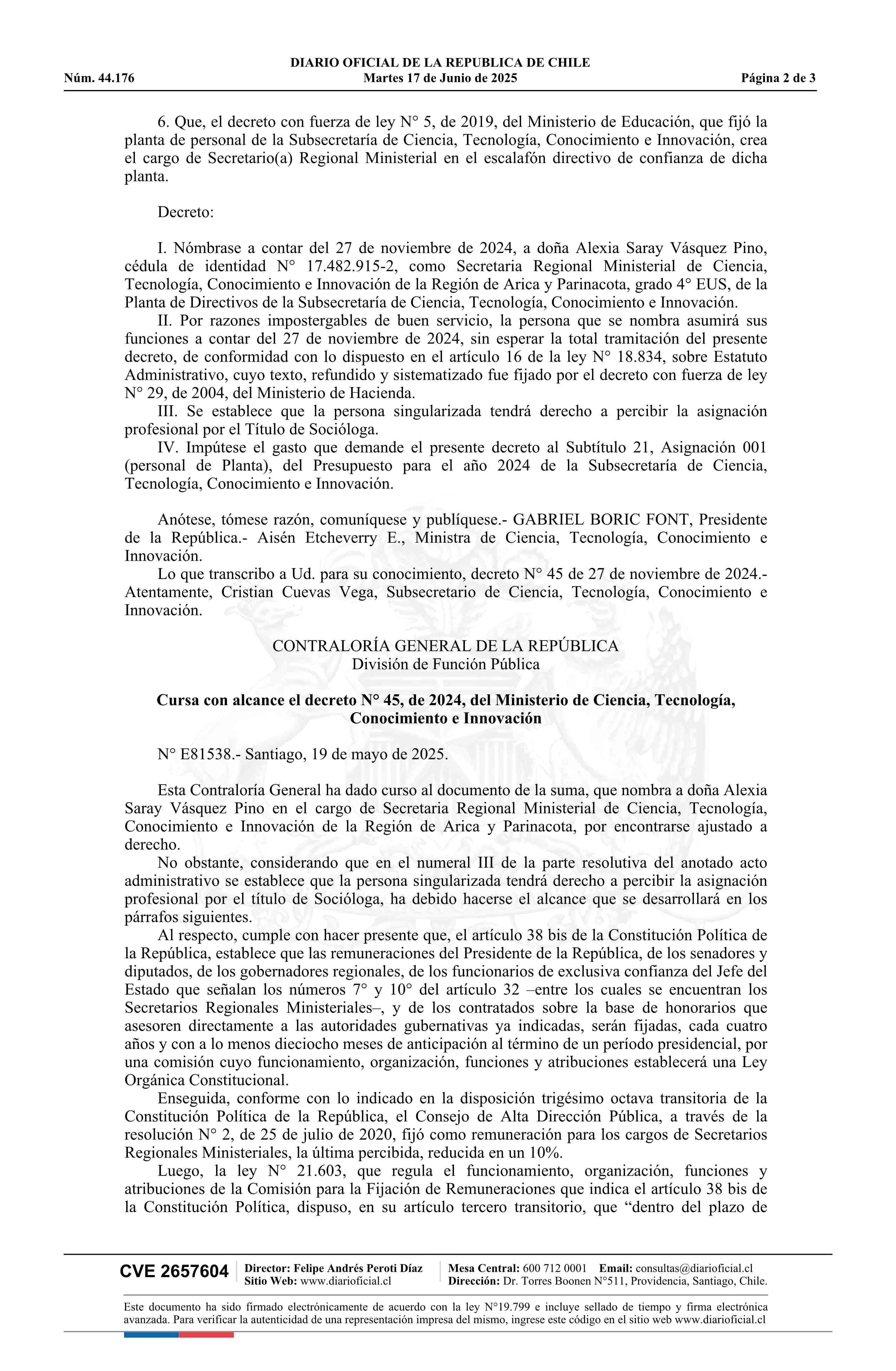 | Título: | Decreto número 45, de 2024.- Nombra a doña Alexia Saray Vásquez Pino en el cargo de Secretaria Regional Ministerial de Ciencia, Tecnología, Conocimiento e Innovación de la Región de Arica y Parinacota |
