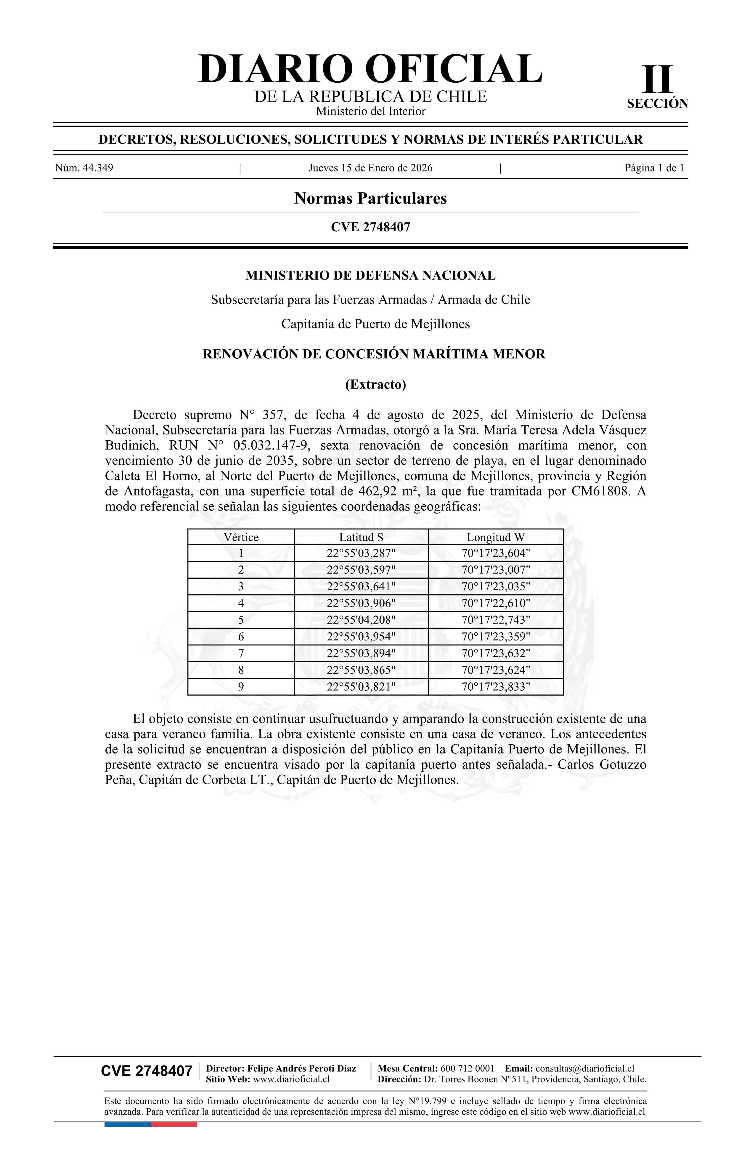 Extracto de decreto número 357, de 2025.- Renovación de concesión marítima menor 15-01-2026 Diario Oficial Edición Electrónica |