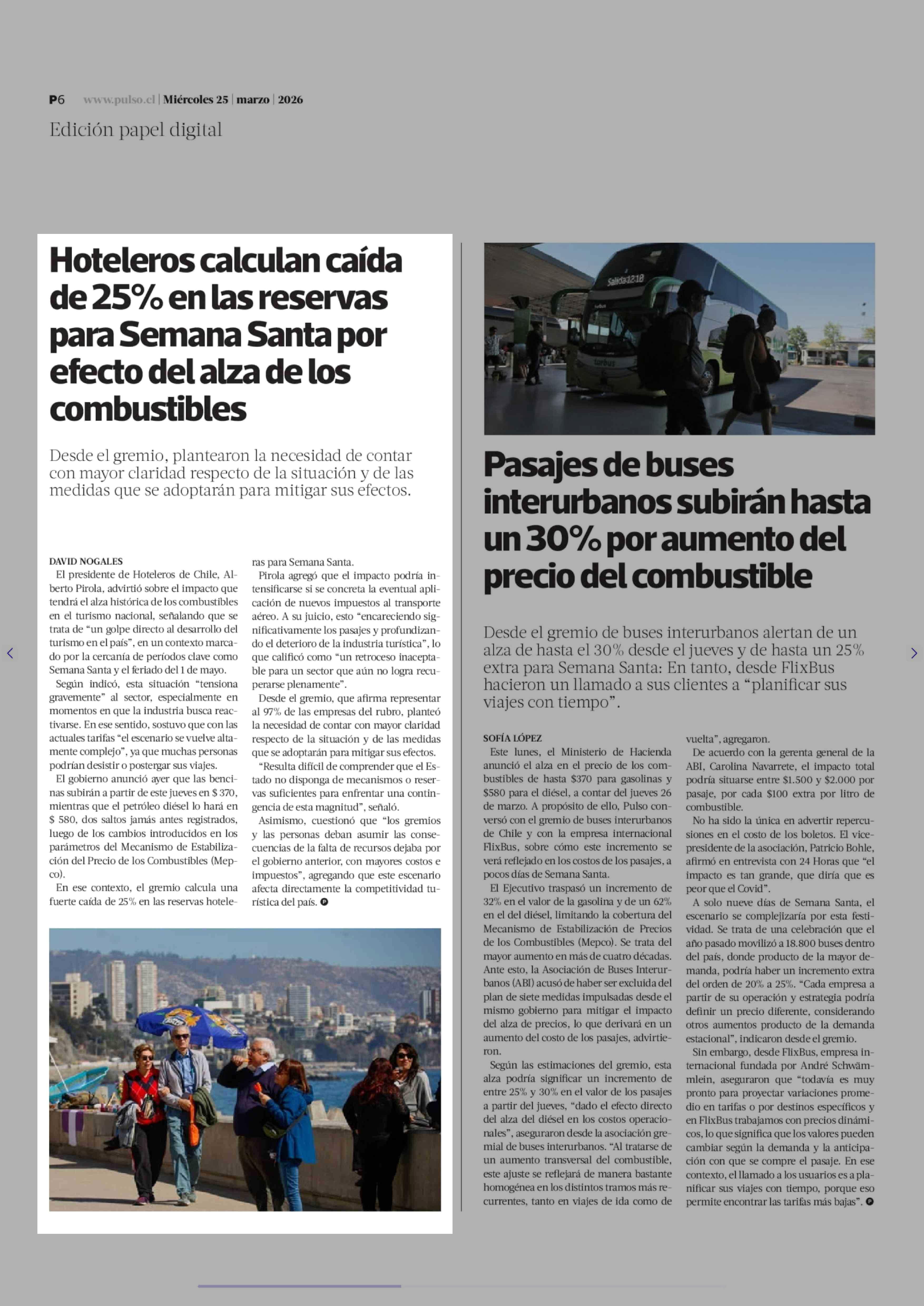 Hoteleros calculan caída de 25% en las reservas para Semana Santa por efecto del alza de los combustibles 25-03-2026 La Tercera |