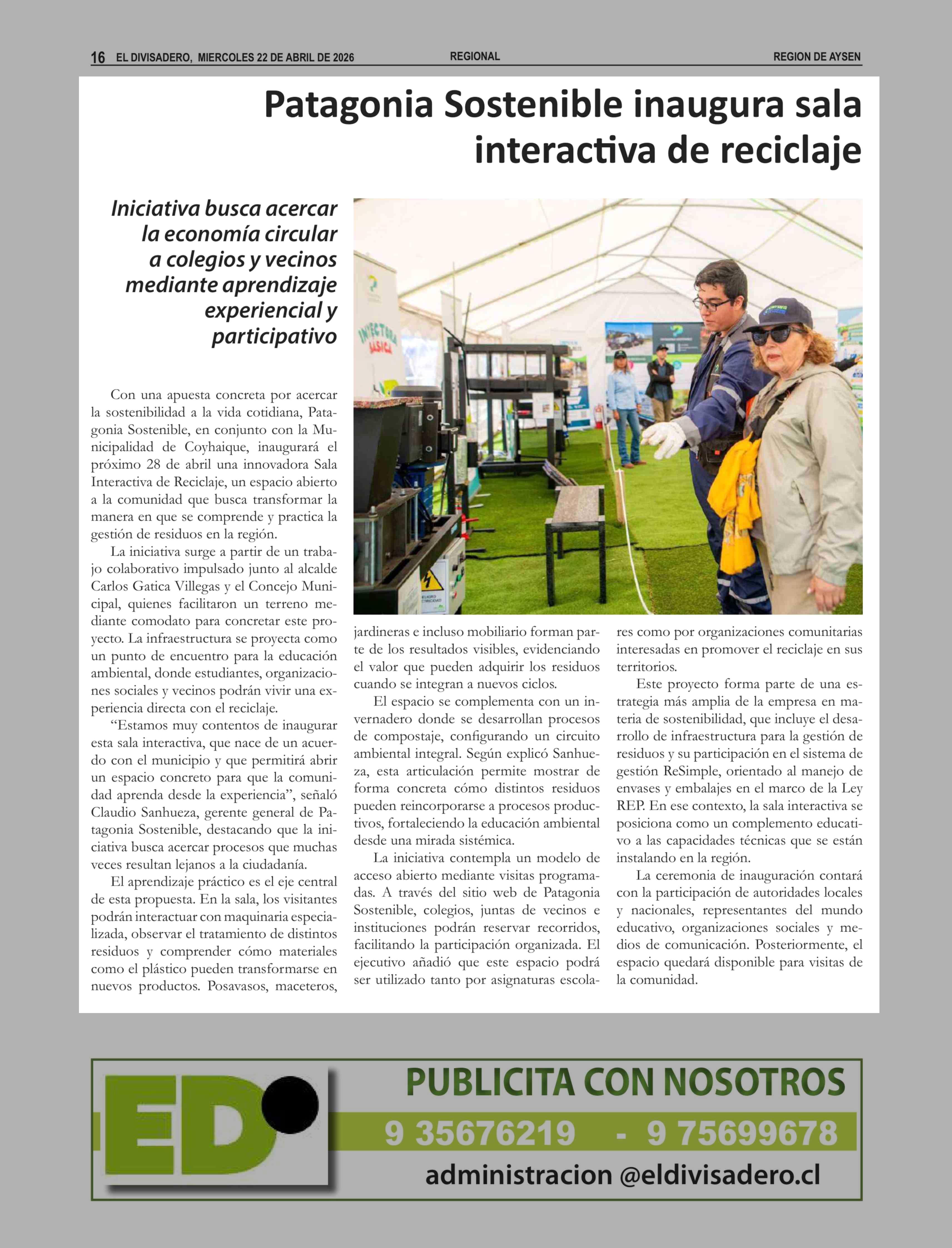 Patagonia Sostenible inaugura sala interactiva de reciclaje 22-04-2026 El Divisadero |