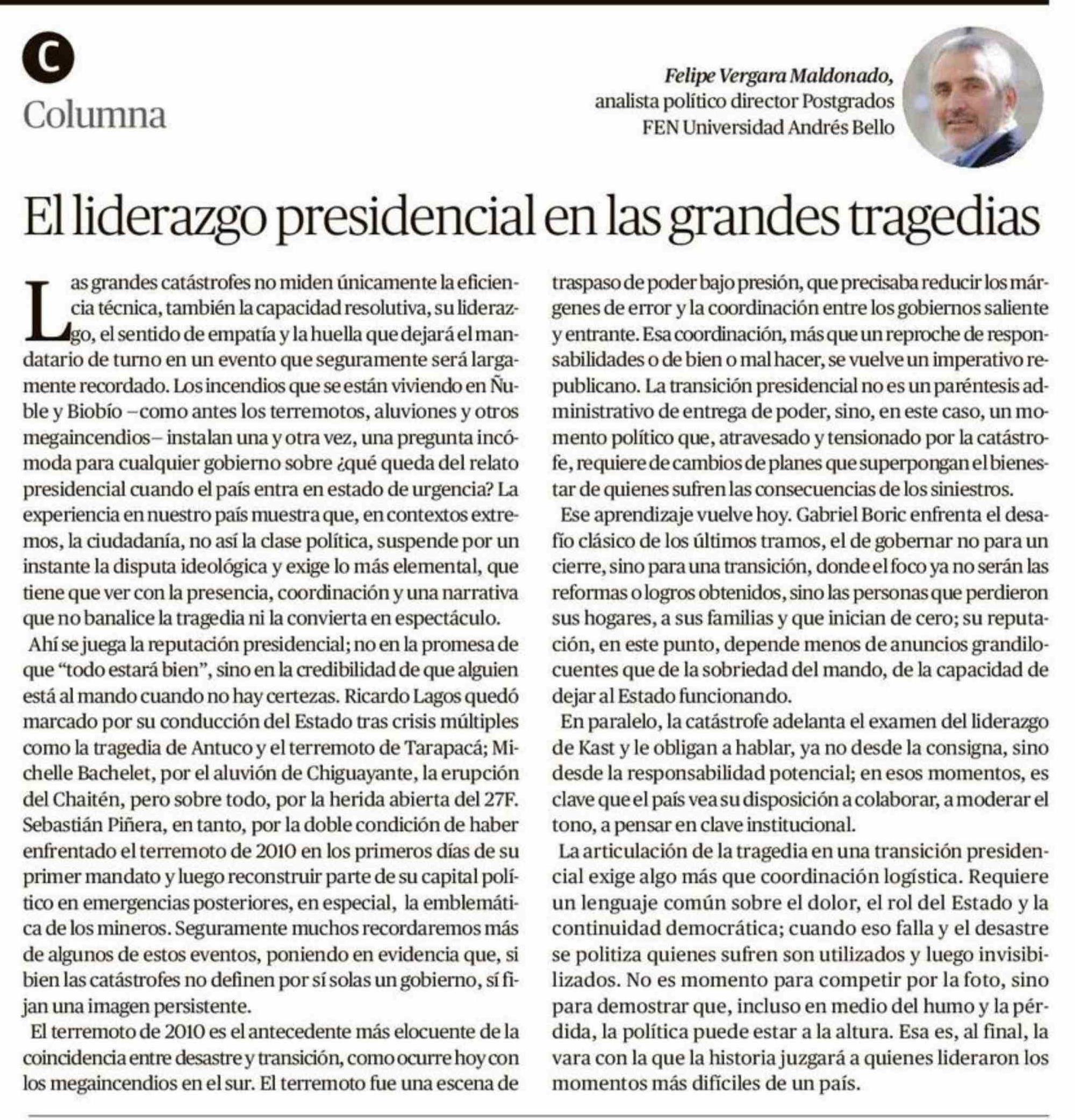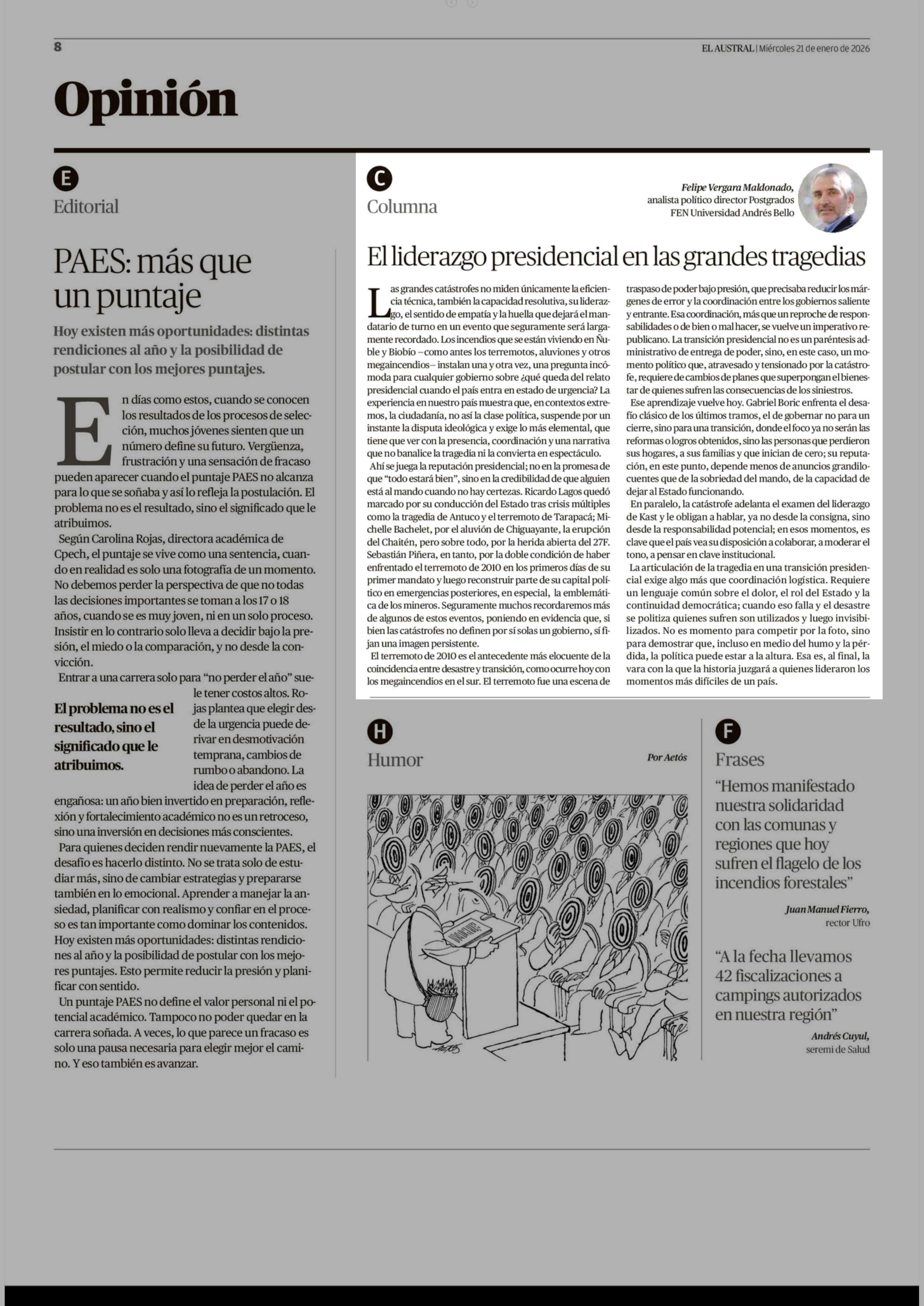 Columnas de Opinión: El liderazgo presidencial en las grandes tragedias 21-01-2026 El Austral de la Araucanía |