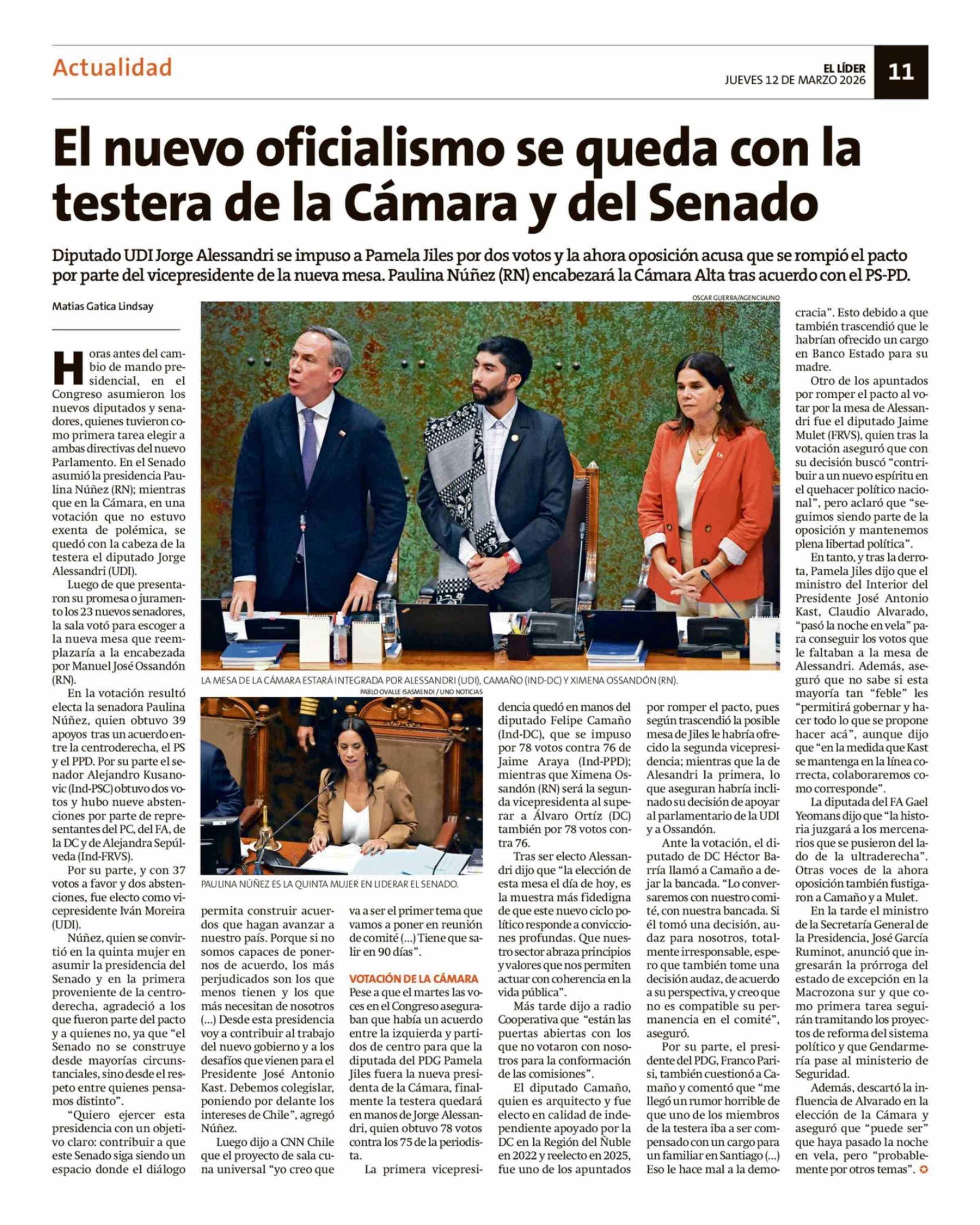 El nuevo oficialismo se queda con la testera de la Cámara y del Senado 12-03-2026 El Líder |