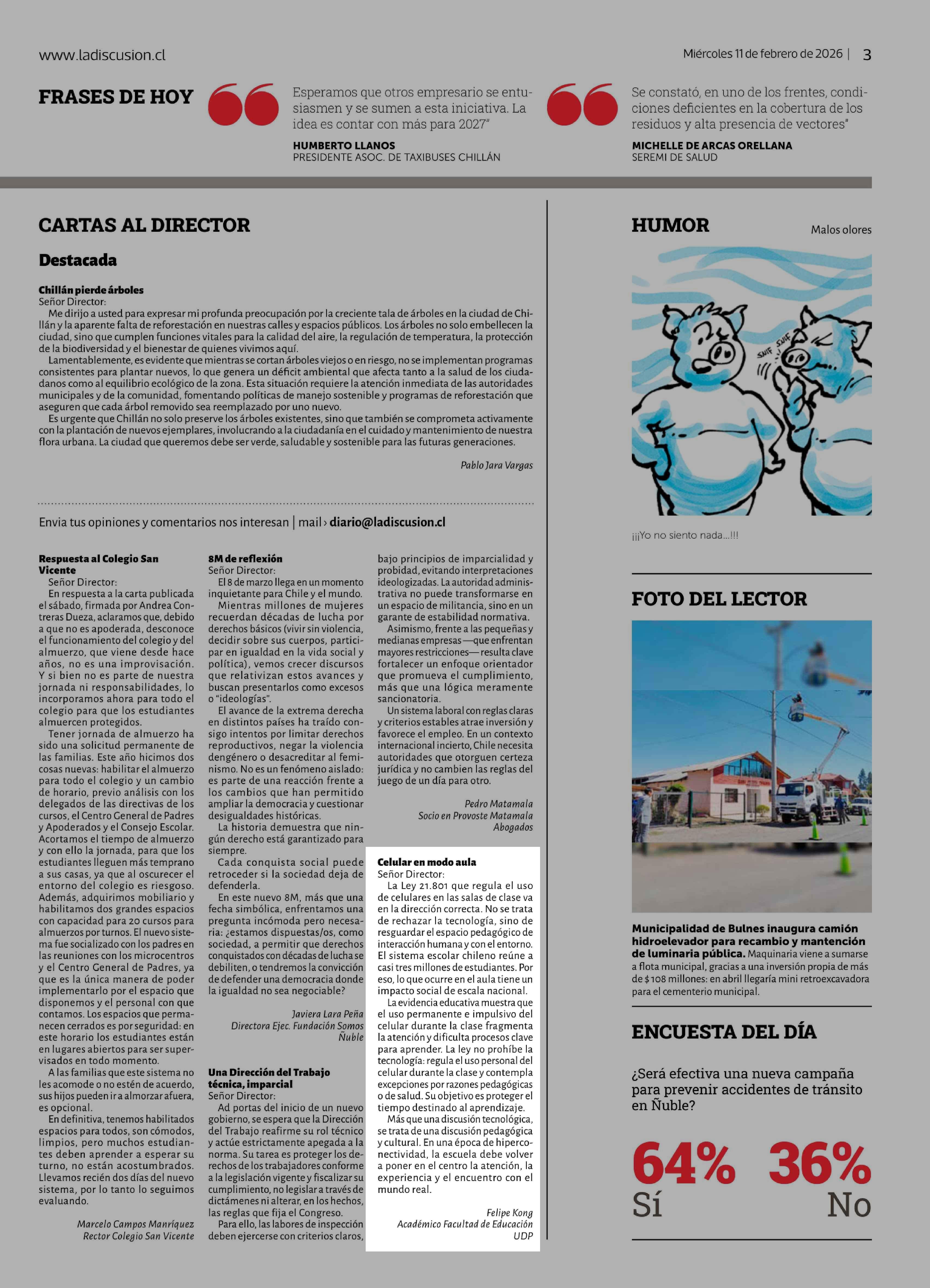 | Título: | Cartas: Celular en modo aula Señor Director: La Ley 21.801 que regula el uso de celulares en las salas de clase va en la dirección correcta. No se trata de rechazar la tecnología, sino de resguardar el espacio pedagógico de interacción humana y con el entorno. El sistema escolar chileno reúne a casi |