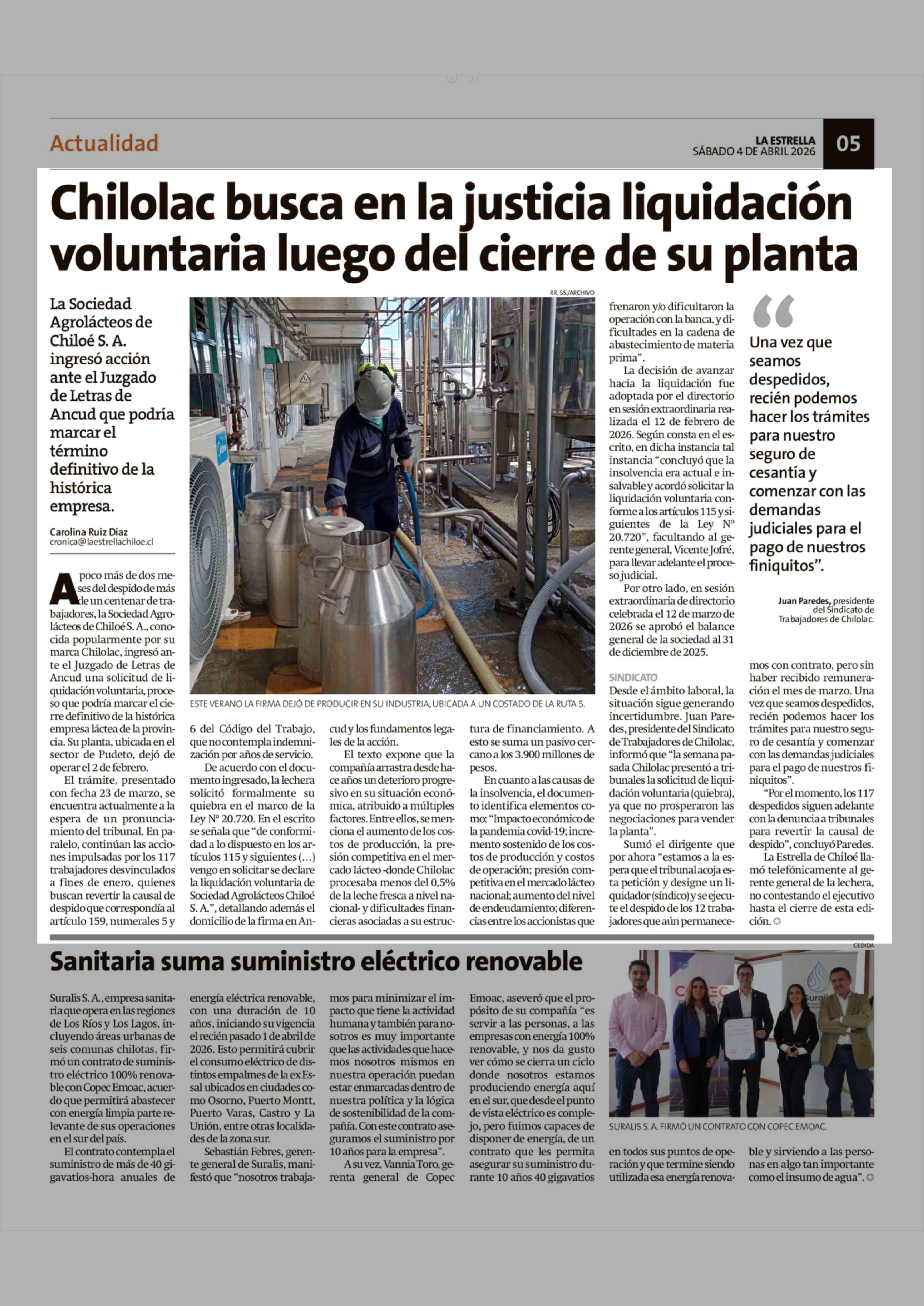 Chilolac busca en la justicia liquidación voluntaria luego del cierre de su planta 04-04-2026 La Estrella de Chiloé |
