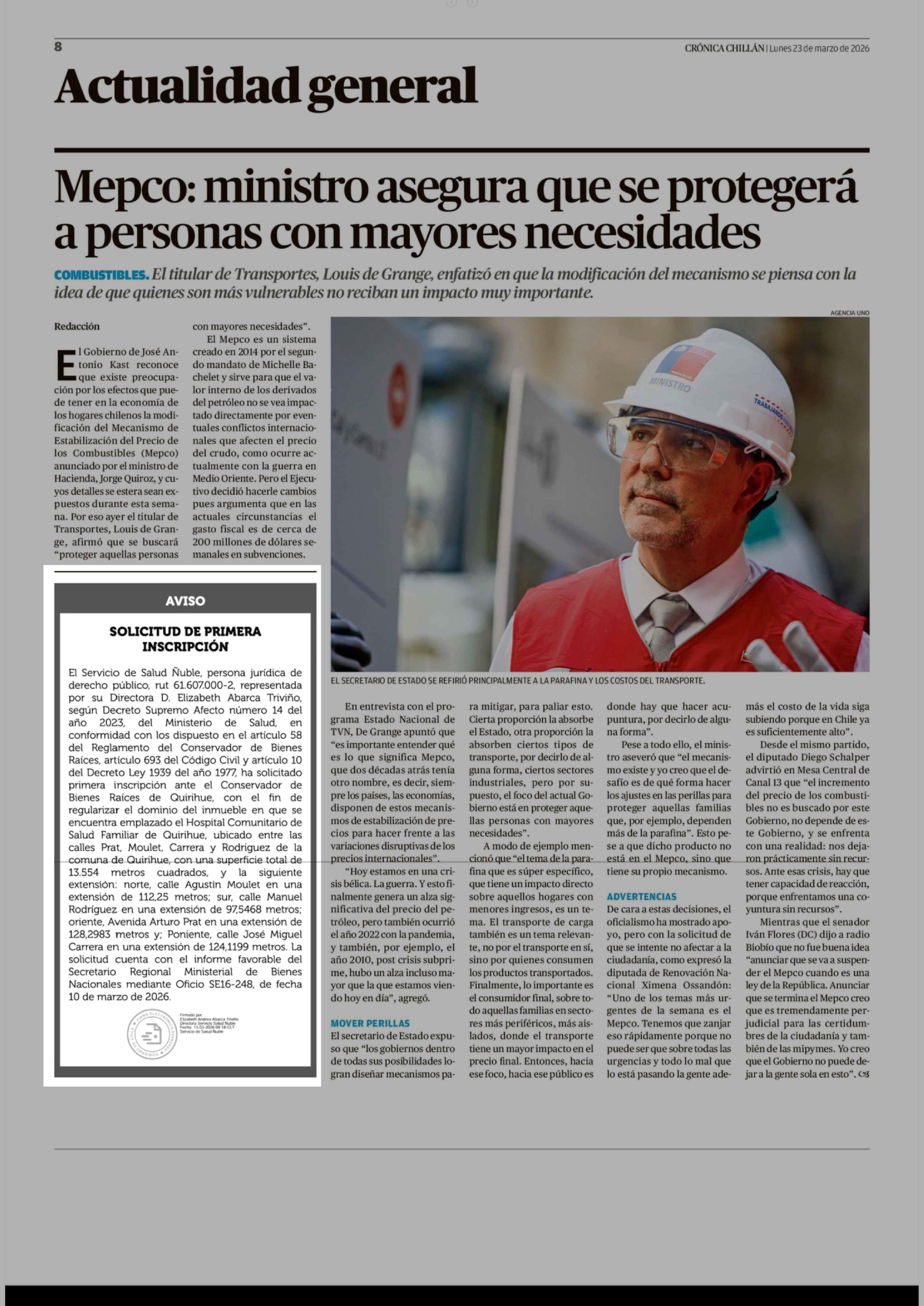 EXTRACTOS: AVISO SOLICITUD DE PRIMERA INSCRIPCIÓN 23-03-2026 Crónica de Chillán |