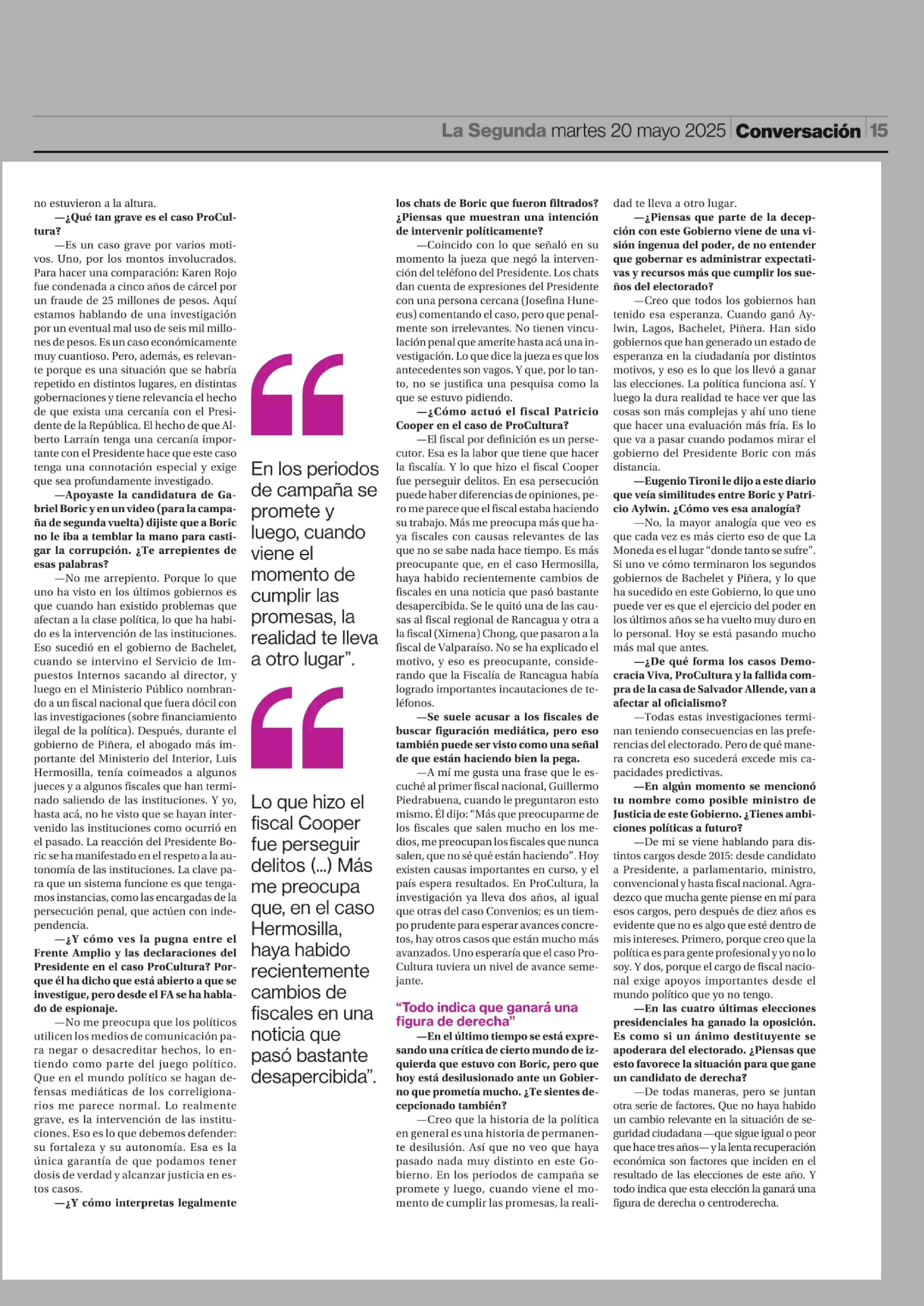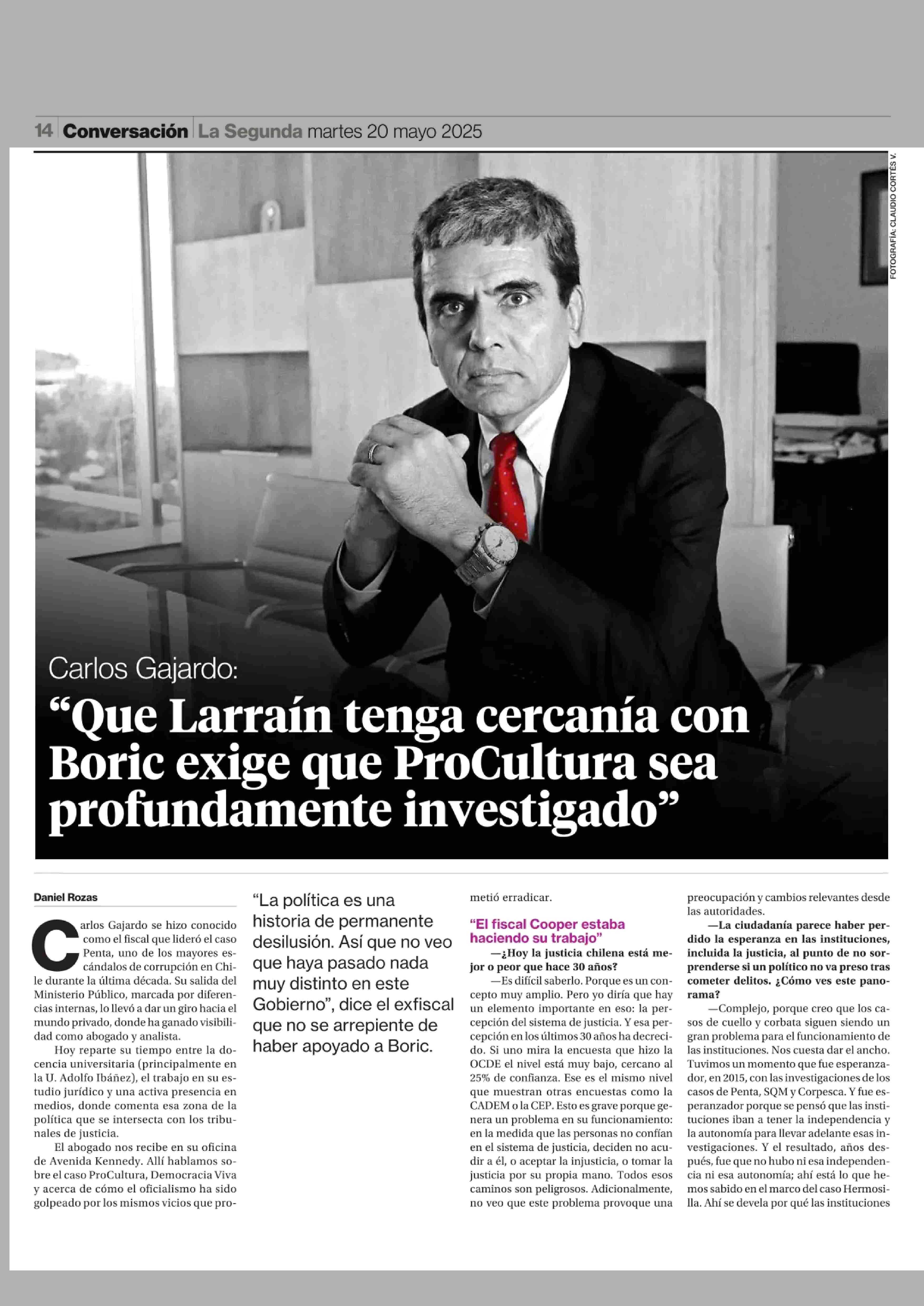 "Que Larraín tenga cercanía con Boric exige que ProCultura sea profundamente investigado” 20-05-2025 La Segunda |
