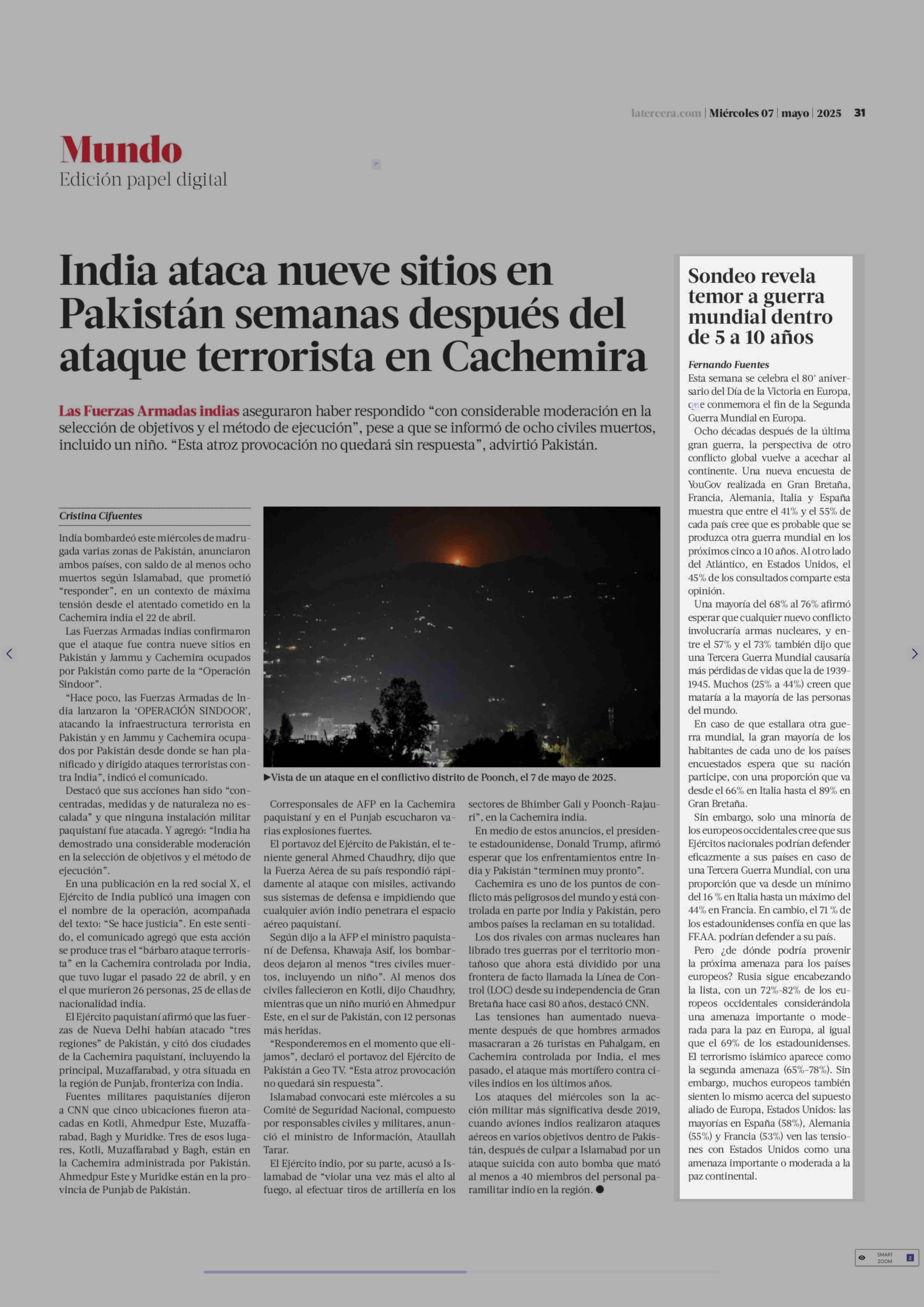 Sondeo revela temor a guerra mundial dentro de 5 a10 años 07-05-2025 La Tercera |
