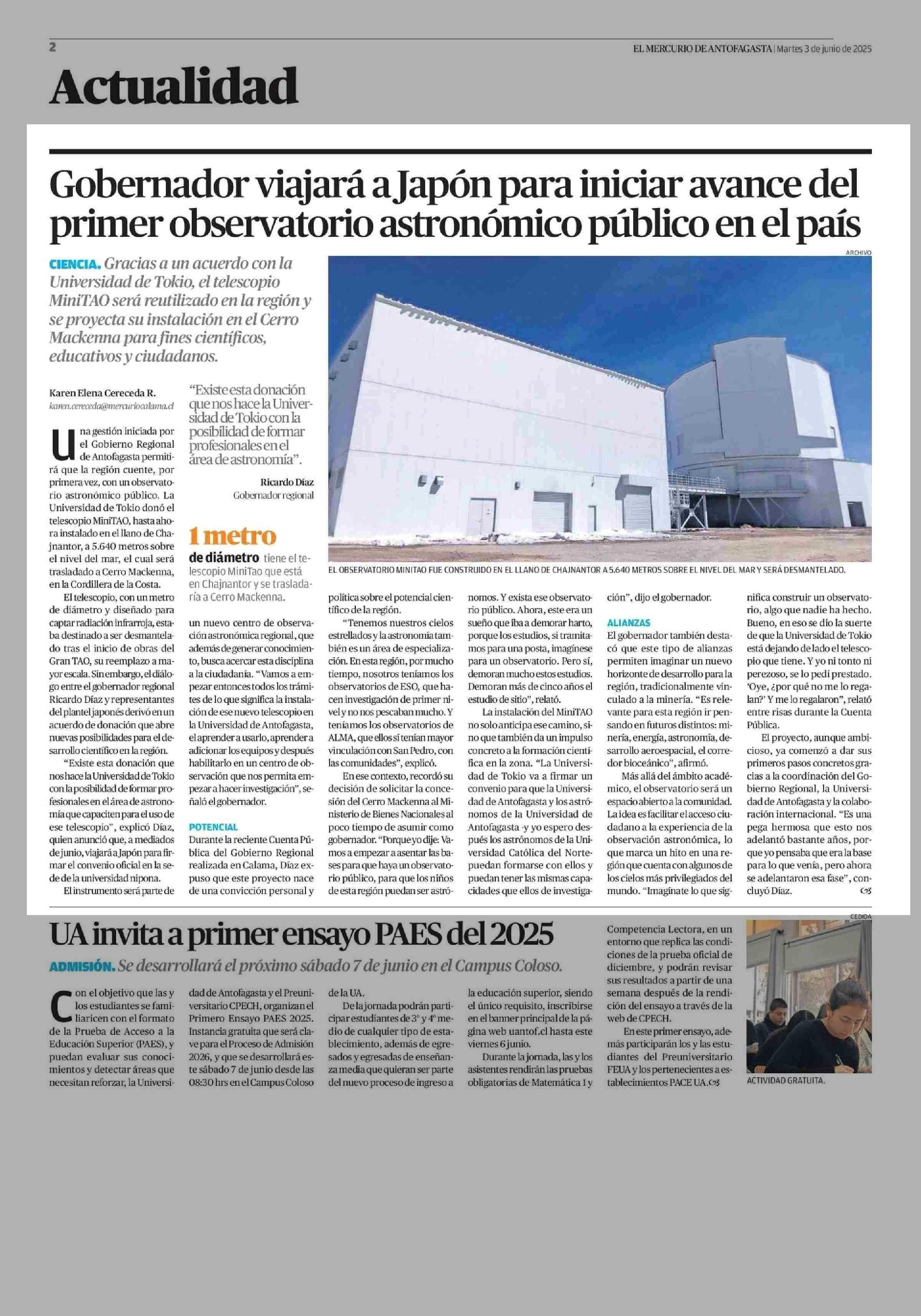 Gobernador viajará a Japón para iniciar avance del primer observatorio astronómico público en el país 03-06-2025 El Mercurio de Antofagasta |