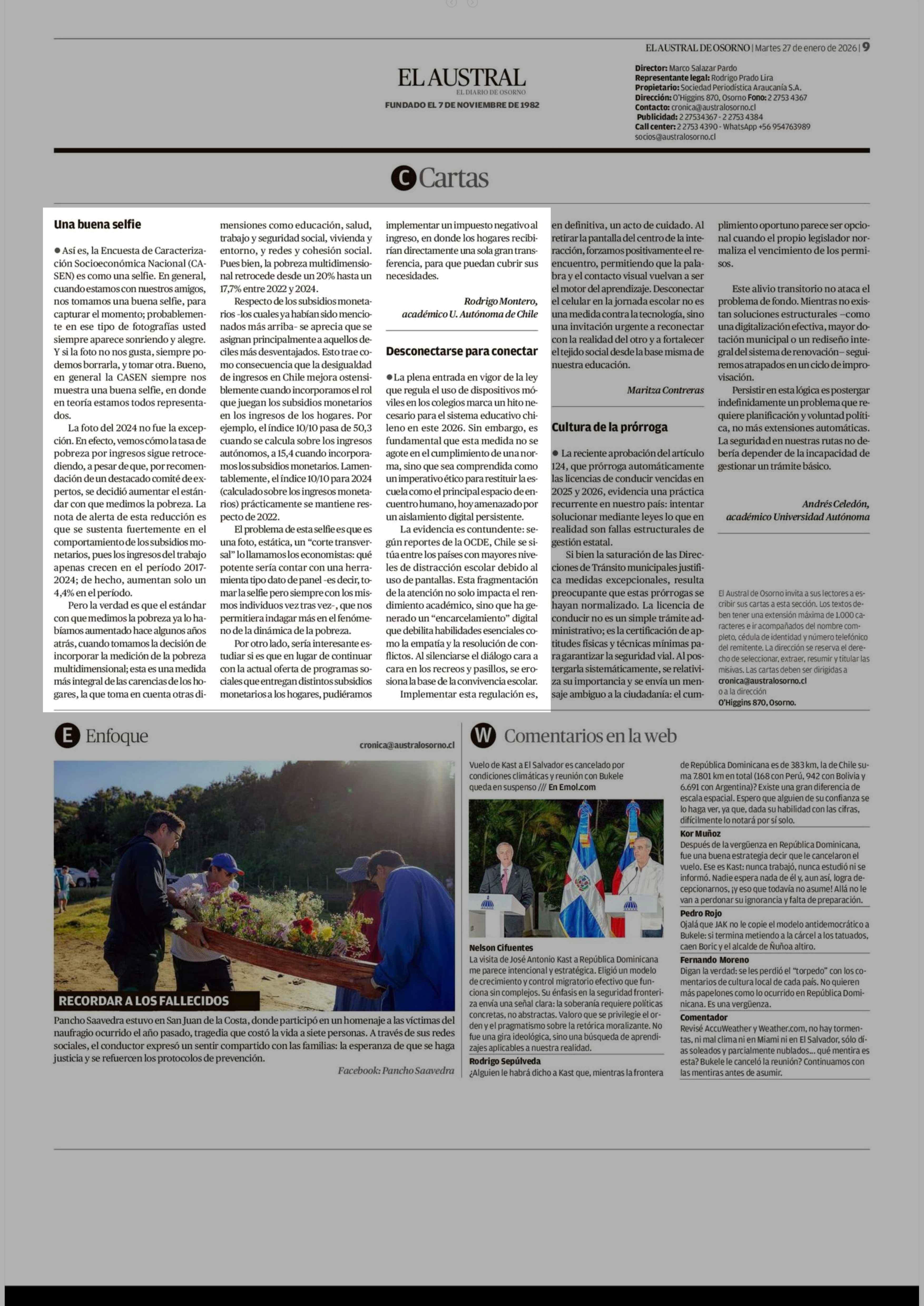 Cartas: Una buena selfie 27-01-2026 El Austral de Osorno |