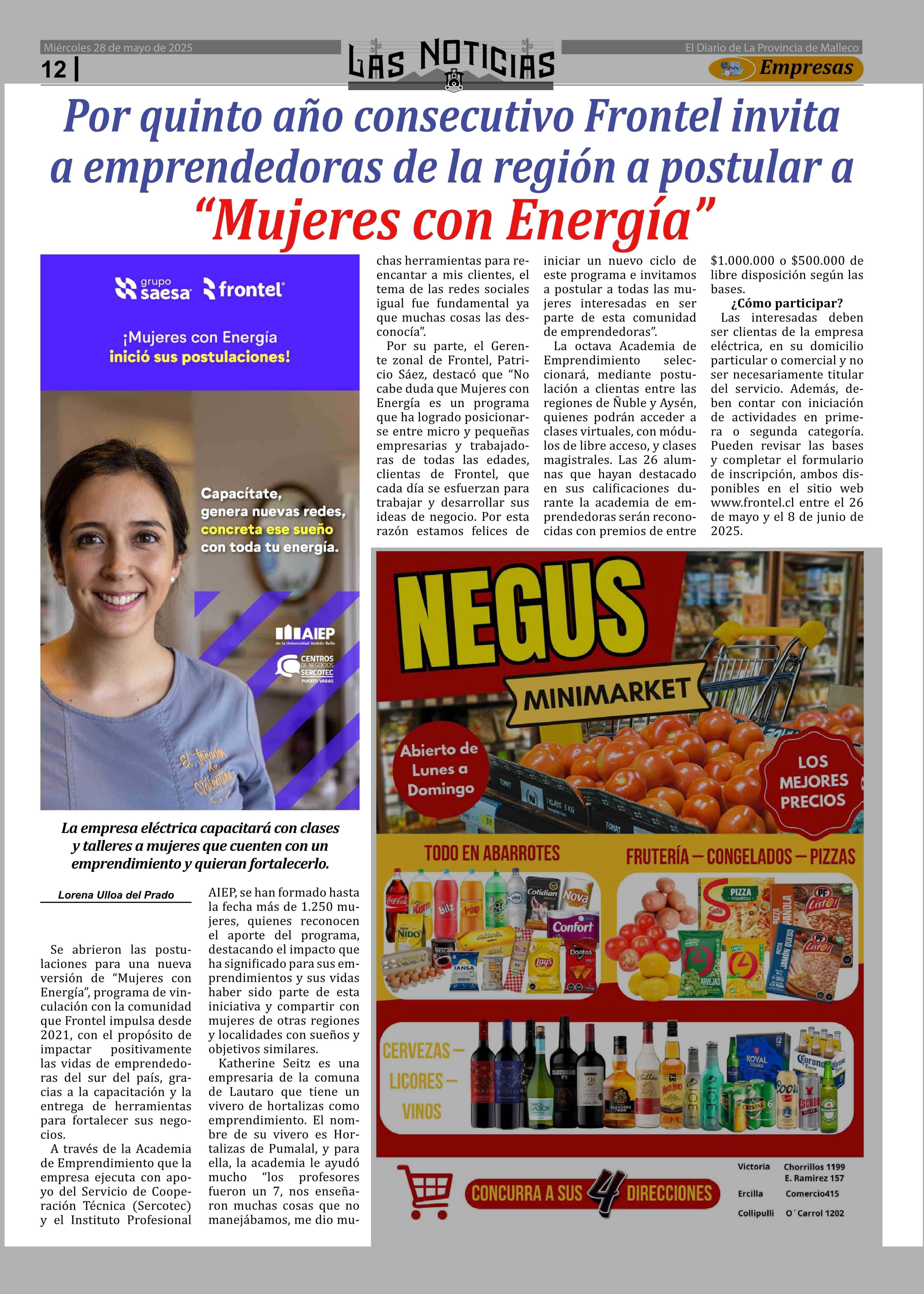 Por quinto año consecutivo Frontel invita a emprendedoras de la región a postular a “Mujeres con Energía” 28-05-2025 Las Noticias |