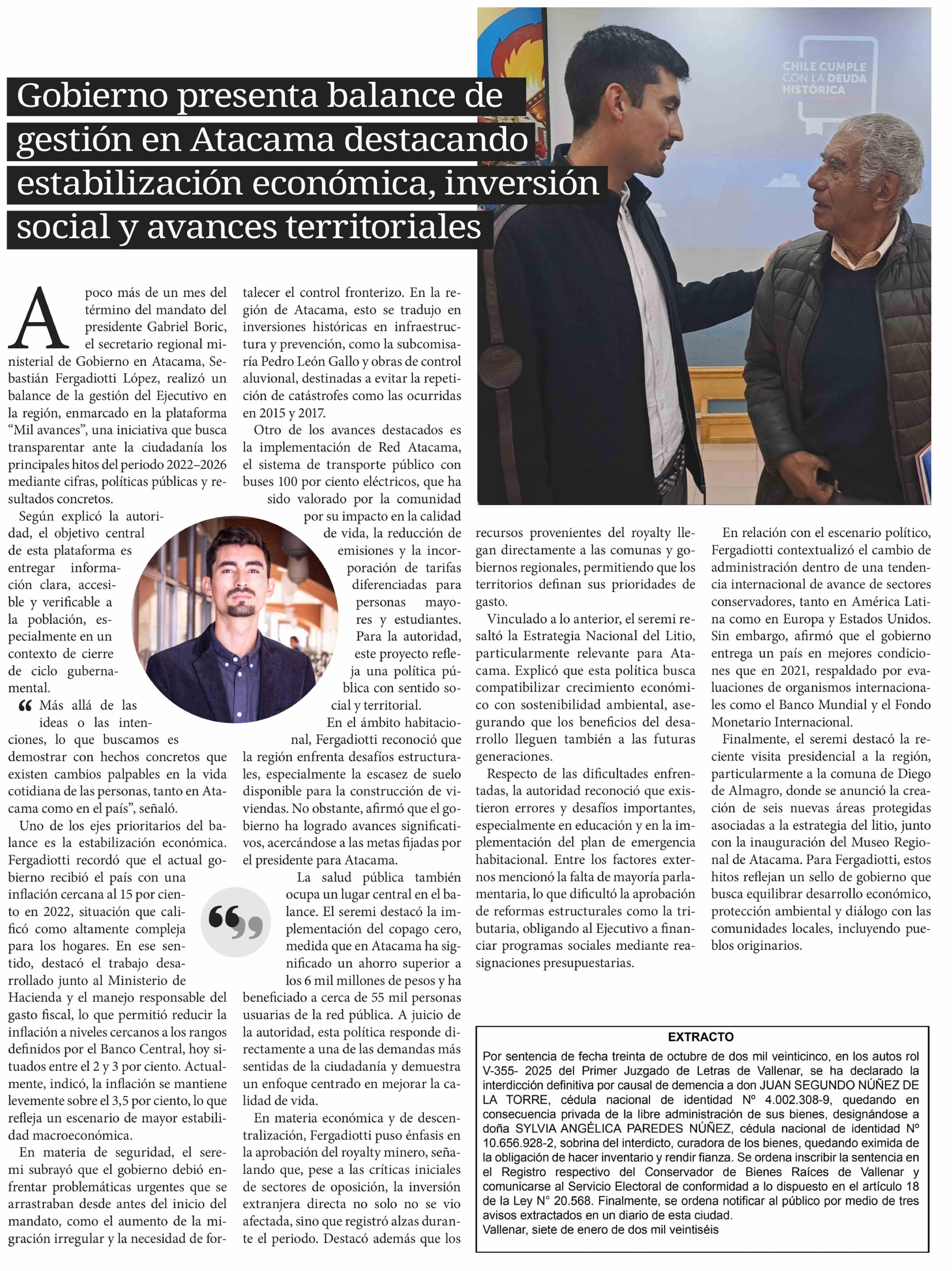 Gobierno presenta balance de gestión en Atacama destacando estabilización económica, inversión social y avances territoriales 03-02-2026 Diario Chañarcillo |
