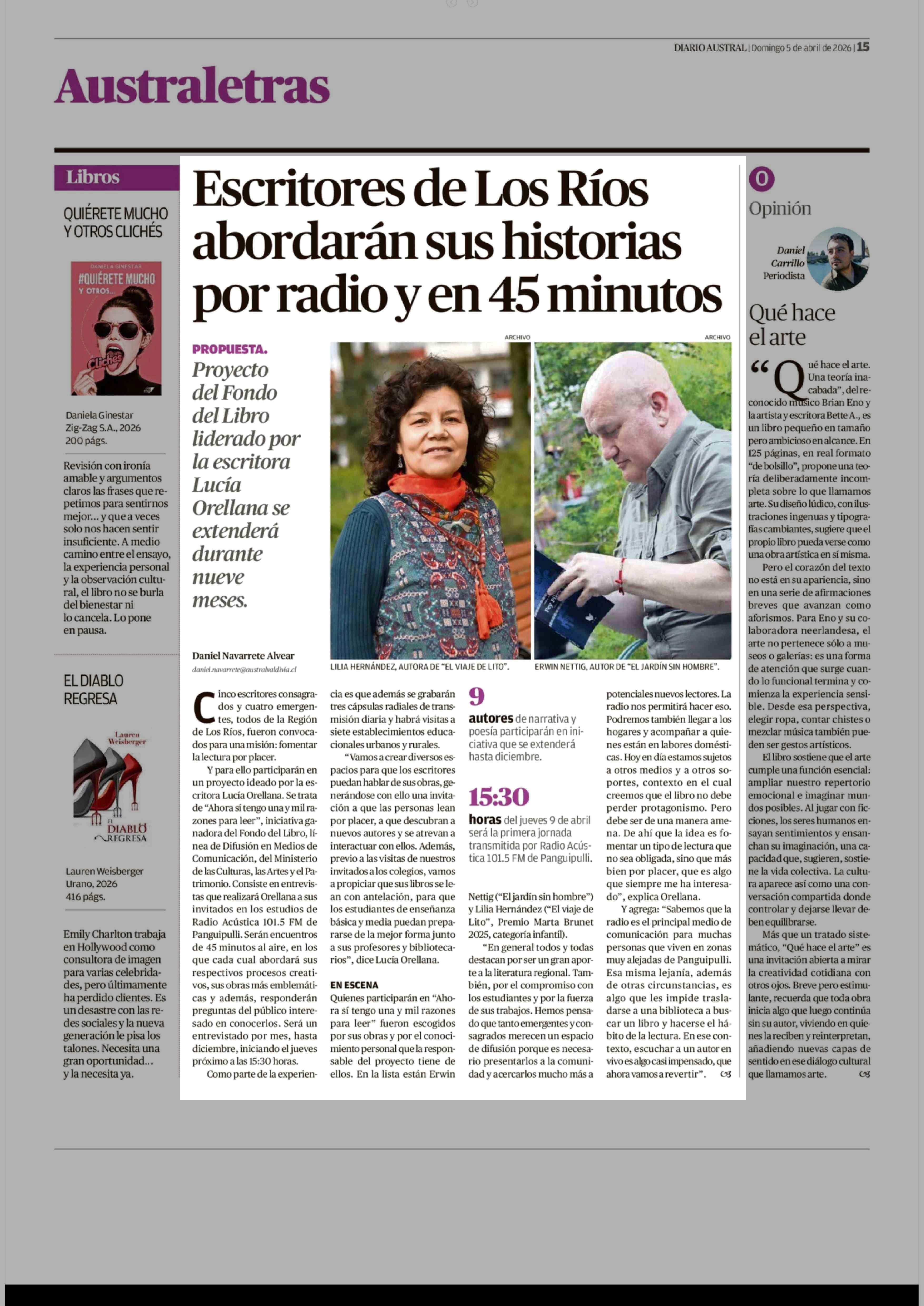 Escritores de Los Ríos abordarán sus historias por radio y en 45 minutos 05-04-2026 Diario Austral Región de Los Ríos |