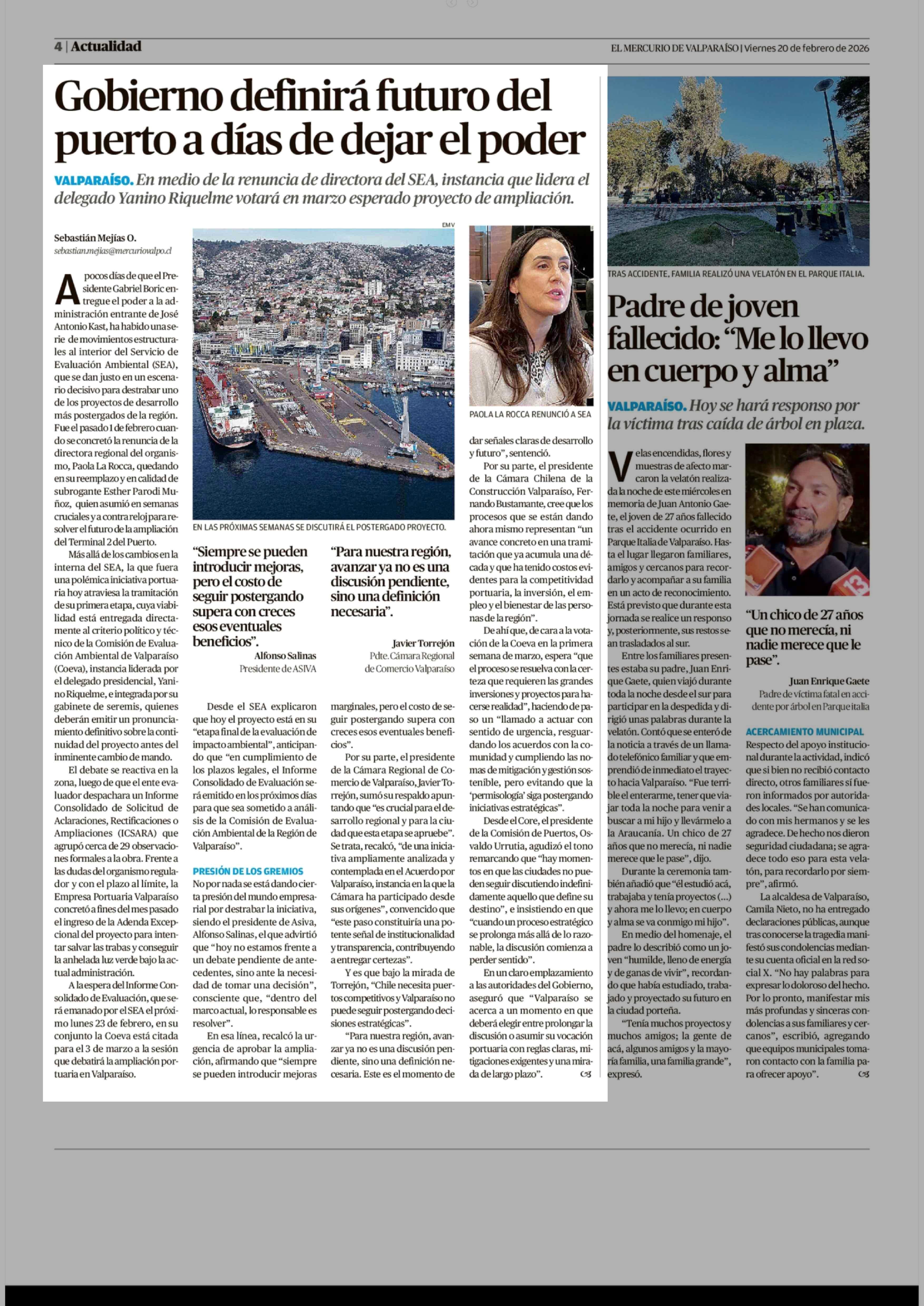 Gobierno definirá futuro del puerto a días de dejar el poder 20-02-2026 El Mercurio de Valparaíso |