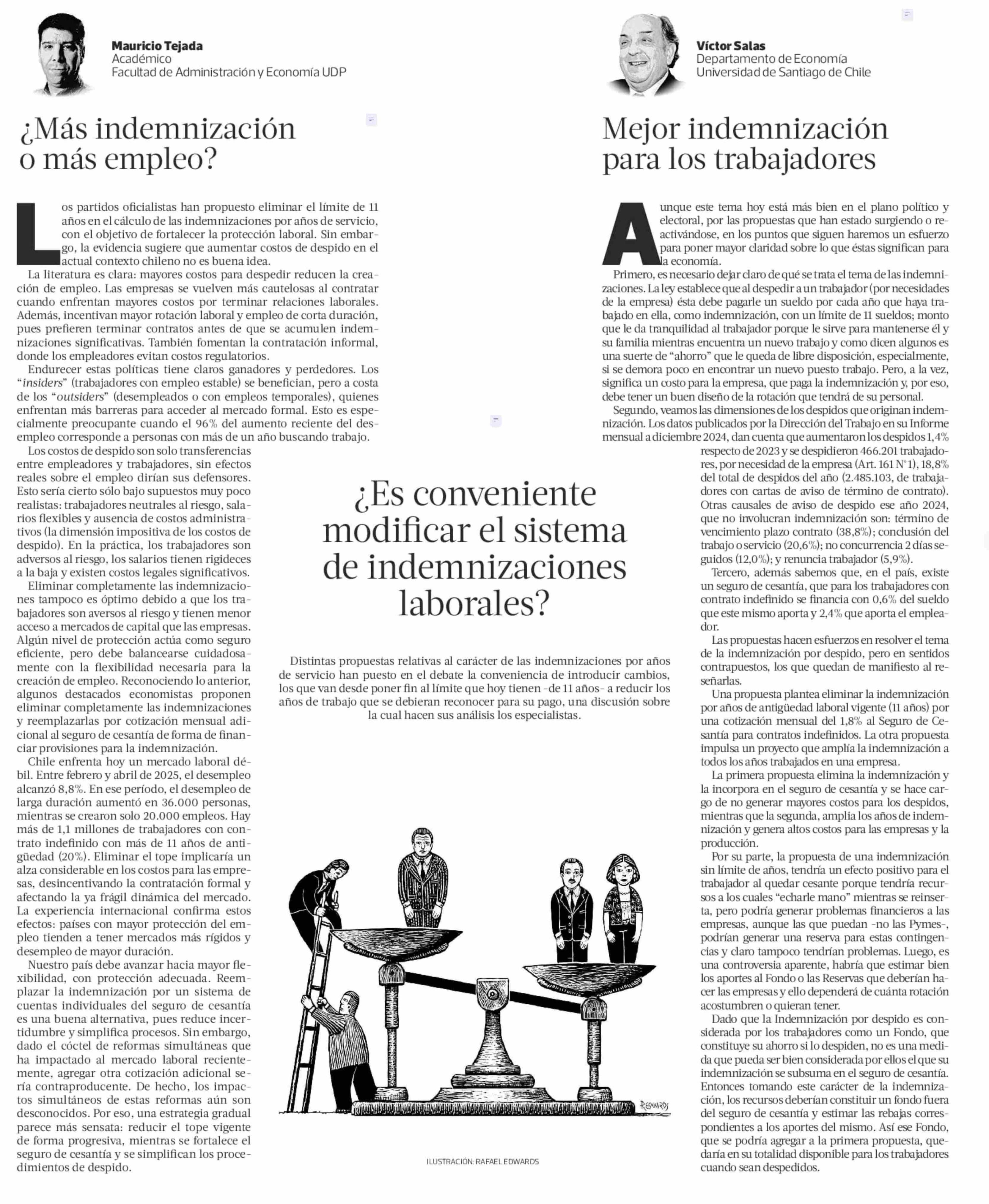 COLUMNAS DE OPINIÓN: ¿Es conveniente modificar el sistema de indemnizaciones laborales? 14-06-2025 La Tercera |